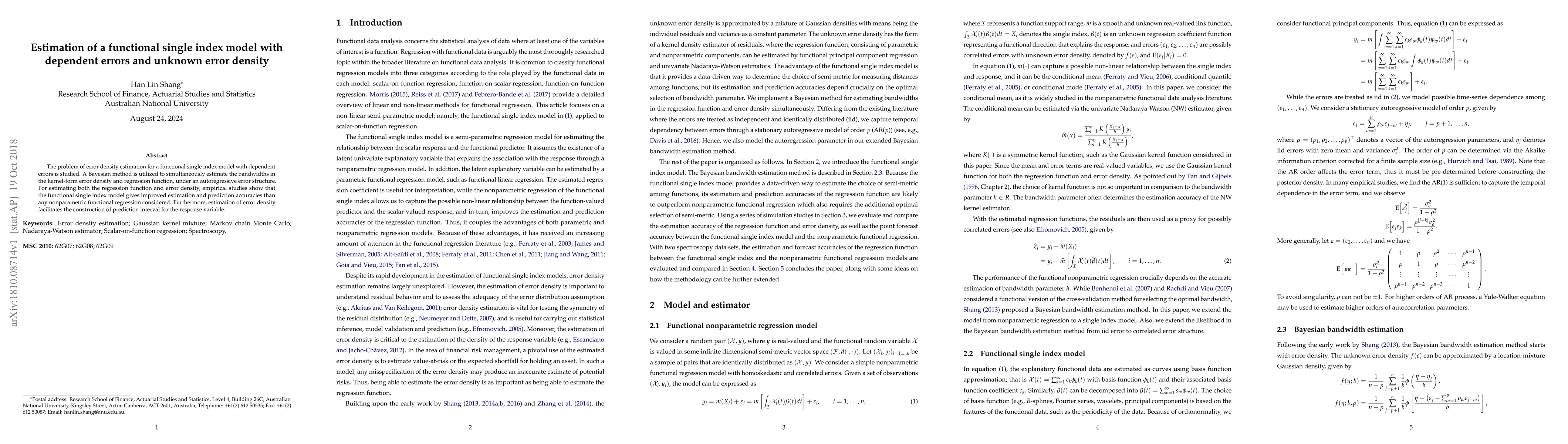 Summary: This paper proposes a Bayesian method to estimate a functional single index model with dependent errors and unknown error density, achieving improved estimation and prediction accuracy compared to other nonparametric methods. It also facilitates the construction of prediction intervals for the response variable.