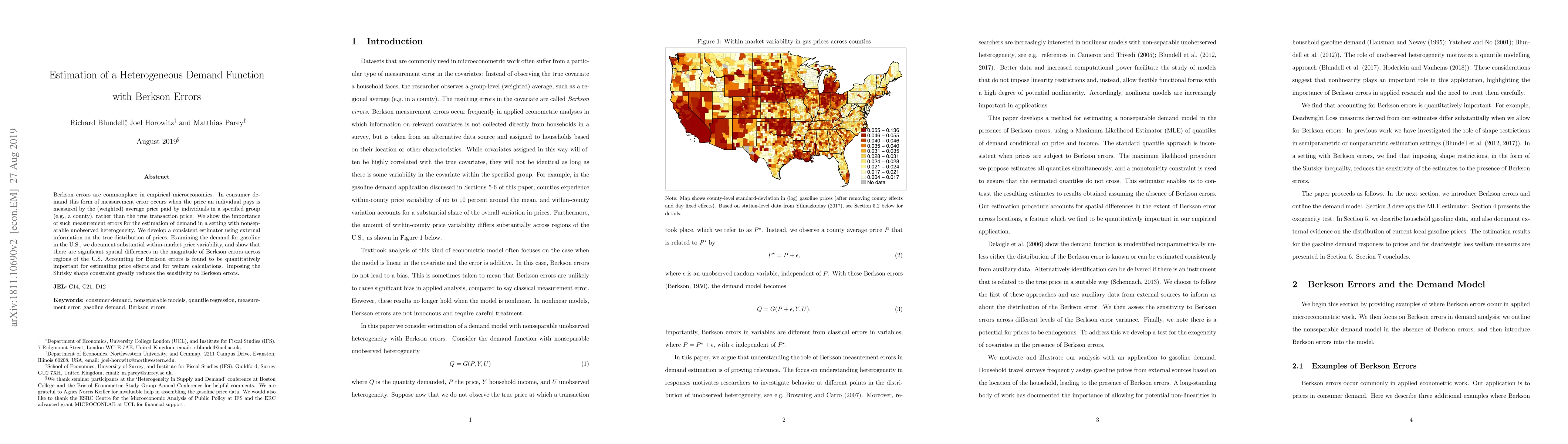 This paper develops a consistent estimator for a heterogeneous demand function affected by Berkson errors, which occur when average group prices are used instead of true transaction prices. It finds significant spatial differences in Berkson errors across U.S. regions and emphasizes the importance of accounting for these errors for accurate price effect estimation and welfare calculations, with the Slutsky shape constraint mitigating sensitivity to these errors.