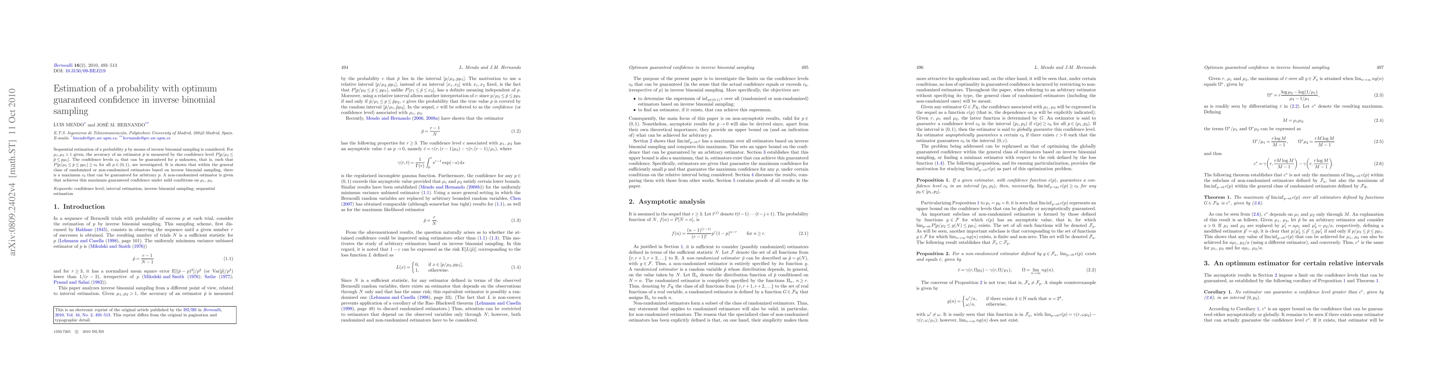This paper investigates the estimation of a probability $p$ using inverse binomial sampling, focusing on achieving the highest guaranteed confidence level $c_0$ for the estimator $\hat{p}$. A non-randomized estimator is presented that maximizes this guaranteed confidence level under specified conditions on $\mu_1$ and $\mu_2$.