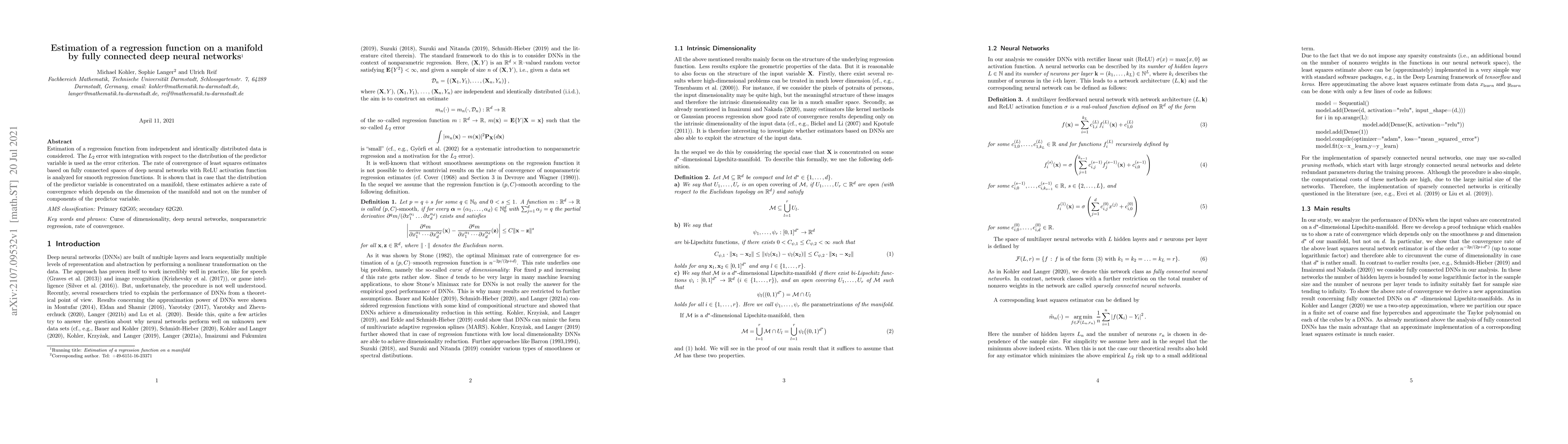 Estimation of a regression function from independent and identically distributed data is considered. The $L_2$ error with integration with respect to the distribution of the predictor variable is used as the error criterion. The rate of convergence of least squares estimates based on fully connected spaces of deep neural networks with ReLU activation function is analyzed for smooth regression functions. It is shown that in case that the distribution of the predictor variable is concentrated on a manifold, these estimates achieve a rate of convergence which depends on the dimension of the manifold and not on the number of components of the predictor variable.