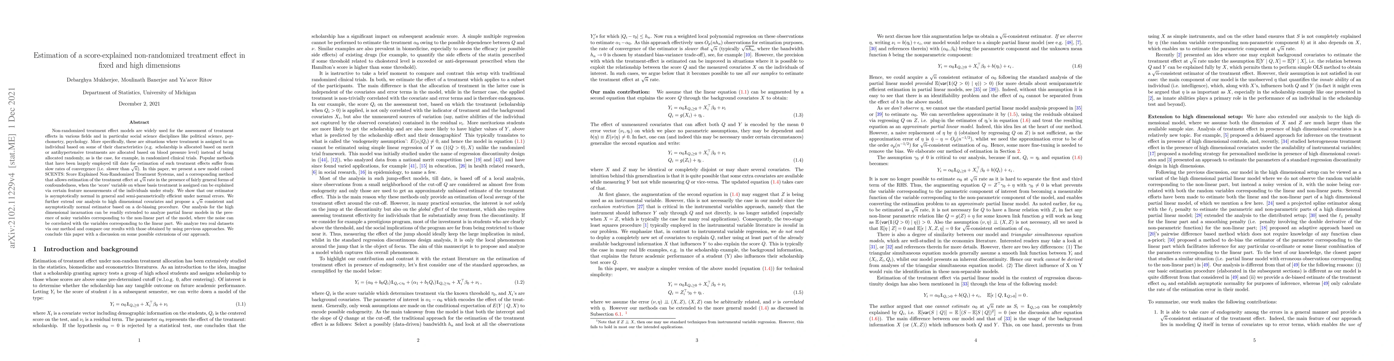 Non-randomized treatment effect models are widely used for the assessment of treatment effects in various fields and in particular social science disciplines like political science, psychometry, psychology. More specifically, these are situations where treatment is assigned to an individual based on some of their characteristics (e.g. scholarship is allocated based on merit or antihypertensive treatments are allocated based on blood pressure level) instead of being allocated randomly, as is the case, for example, in randomized clinical trials. Popular methods that have been largely employed till date for estimation of such treatment effects suffer from slow rates of convergence (i.e. slower than $\sqrt{n}$). In this paper, we present a new model coined SCENTS: Score Explained Non-Randomized Treatment Systems, and a corresponding method that allows estimation of the treatment effect at $\sqrt{n}$ rate in the presence of fairly general forms of confoundedness, when the `score' variable on whose basis treatment is assigned can be explained via certain feature measurements of the individuals under study. We show that our estimator is asymptotically normal in general and semi-parametrically efficient under normal errors. We further extend our analysis to high dimensional covariates and propose a $\sqrt n$ consistent and asymptotically normal estimator based on a de-biasing procedure. Our analysis for the high dimensional incarnation can be readily extended to analyze partial linear models in the presence of noisy variables corresponding to the non-linear part of the model, where the noise can be correlated with the variables corresponding to the linear part. We analyze two real datasets via our method and compare our results with those obtained by using previous approaches. We conclude this paper with a discussion on some possible extensions of our approach.