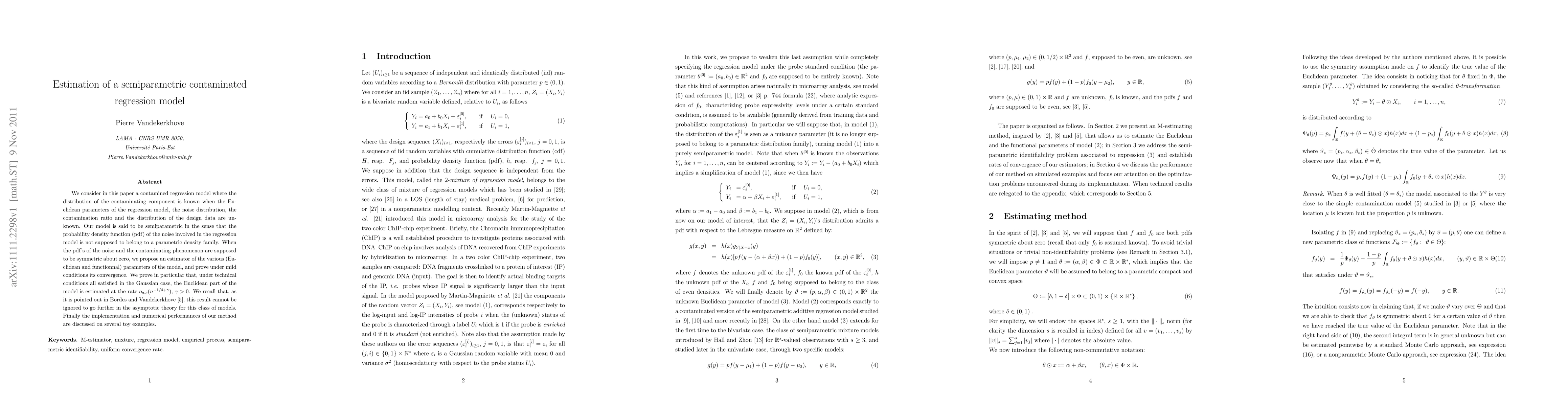 This paper proposes an estimator for a semiparametric contaminated regression model where the contaminating distribution is known, but other model parameters are unknown. The authors develop an estimator under symmetry assumptions and prove its convergence, achieving a rate of estimation for the Euclidean part that is significant for further asymptotic theory.