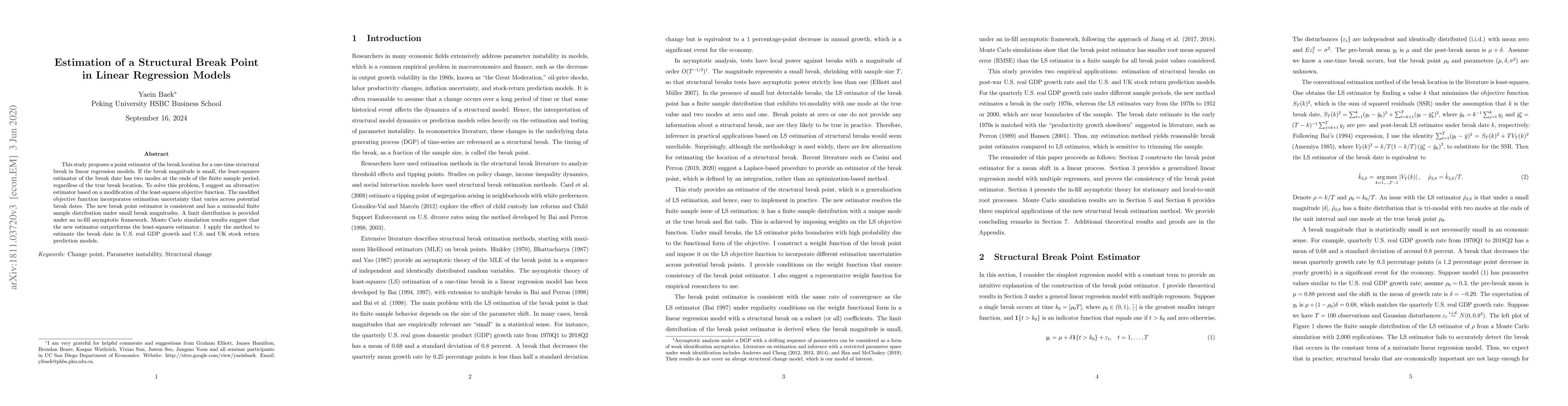 This study introduces a new estimator for identifying the break point in linear regression models, addressing the issue of bimodal least-squares estimates under small break magnitudes. The proposed method modifies the least-squares objective function to incorporate estimation uncertainty, resulting in a consistent and unimodal estimator.
