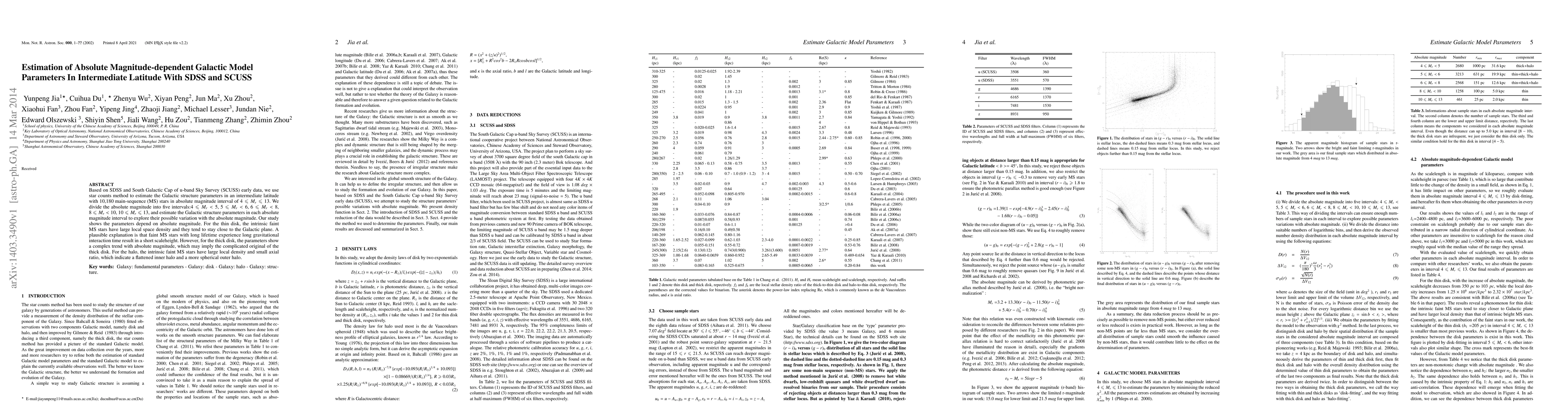 Based on SDSS and South Galactic Cap of u-band Sky Survey (SCUSS) early data, we use star counts method to estimate the Galactic structure parameters in an intermediate latitude with 10,180 main-sequence (MS) stars in absolute magnitude interval of $4 \leq M_r \leq 13$. We divide the absolute magnitude into five intervals:$4 \leq M_r < 5$, $5 \leq M_r < 6$, $6 \leq M_r < 8$, $8 \leq M_r < 10$, $10 \leq M_r \leq 13$, and estimate the Galactic structure parameters in each absolute magnitude interval to explore their possible variation with the absolute magnitude. Our study shows the parameters depend on absolute magnitude. For the thin disk, the intrinsic faint MS stars have large local space density and they tend to stay close to the Galactic plane. A plausible explanation is that faint MS stars with long lifetime experience long gravitational interaction time result in a short scaleheight. However, for the thick disk, the parameters show a complex trend with absolute magnitude, which may imply the complicated original of the thick disk. For the halo, the intrinsic faint MS stars have large local density and small axial ratio, which indicate a flattened inner halo and a more spherical outer halo.