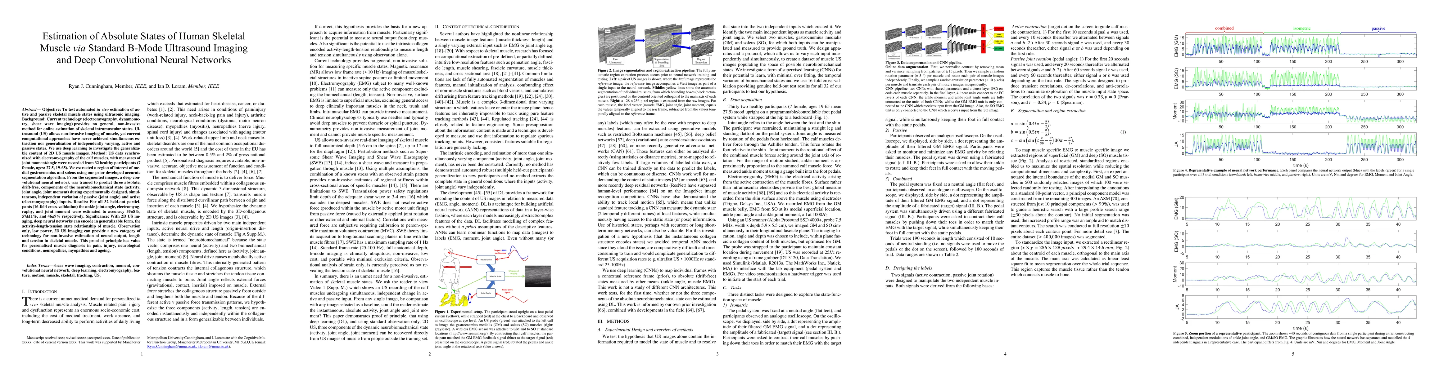 This study employs deep convolutional neural networks to estimate the active and passive states of human skeletal muscle using standard B-mode ultrasound imaging. The neural network achieved accurate predictions of muscle activity, joint angle, and joint moment from 2D US images, suggesting a new non-invasive method for personalized muscle diagnosis and assessment in various conditions.