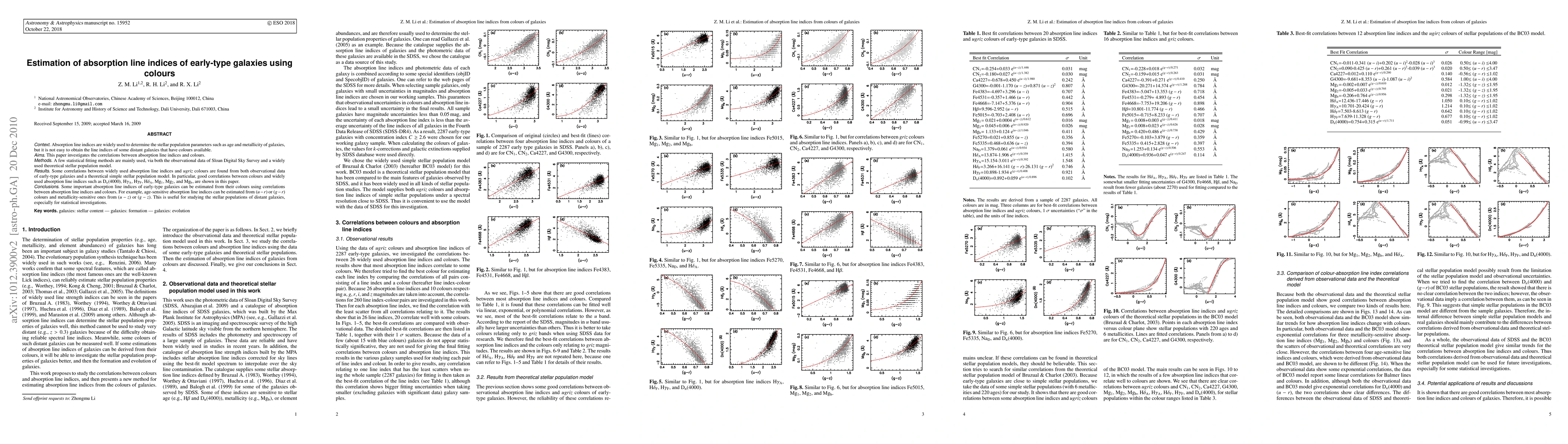 This paper explores correlations between absorption line indices and colours to estimate stellar population parameters in early-type galaxies. It finds strong correlations between colours and indices like Dn(4000), HgammaA, and Mg2, enabling estimation of age and metallicity from colours for distant galaxies.