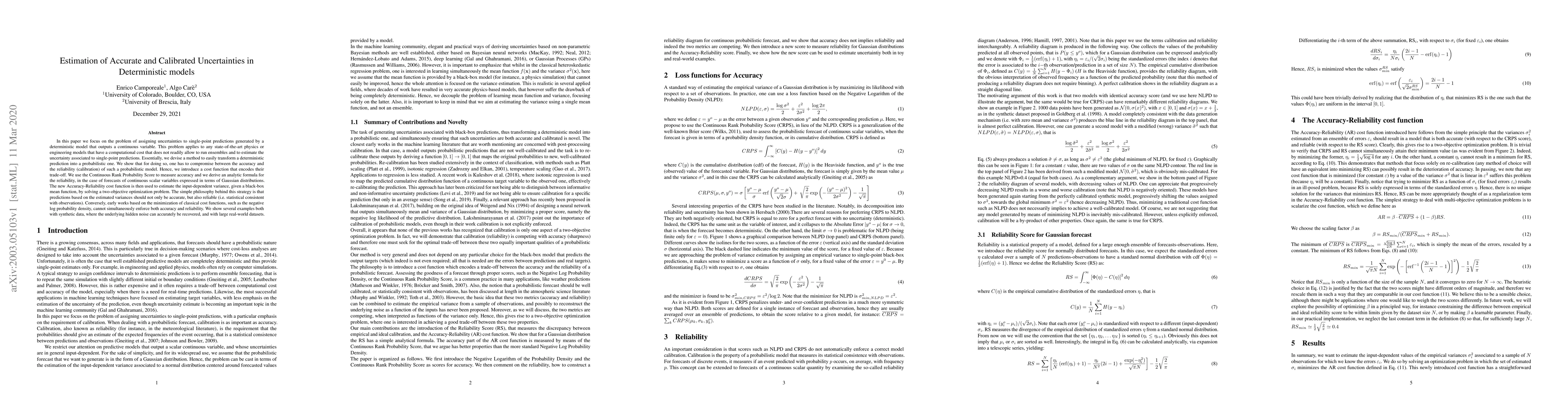 In this paper we focus on the problem of assigning uncertainties to single-point predictions generated by a deterministic model that outputs a continuous variable. This problem applies to any state-of-the-art physics or engineering models that have a computational cost that does not readily allow to run ensembles and to estimate the uncertainty associated to single-point predictions. Essentially, we devise a method to easily transform a deterministic prediction into a probabilistic one. We show that for doing so, one has to compromise between the accuracy and the reliability (calibration) of such a probabilistic model. Hence, we introduce a cost function that encodes their trade-off. We use the Continuous Rank Probability Score to measure accuracy and we derive an analytic formula for the reliability, in the case of forecasts of continuous scalar variables expressed in terms of Gaussian distributions. The new Accuracy-Reliability cost function is then used to estimate the input-dependent variance, given a black-box mean function, by solving a two-objective optimization problem. The simple philosophy behind this strategy is that predictions based on the estimated variances should not only be accurate, but also reliable (i.e. statistical consistent with observations). Conversely, early works based on the minimization of classical cost functions, such as the negative log probability density, cannot simultaneously enforce both accuracy and reliability. We show several examples both with synthetic data, where the underlying hidden noise can accurately be recovered, and with large real-world datasets.
