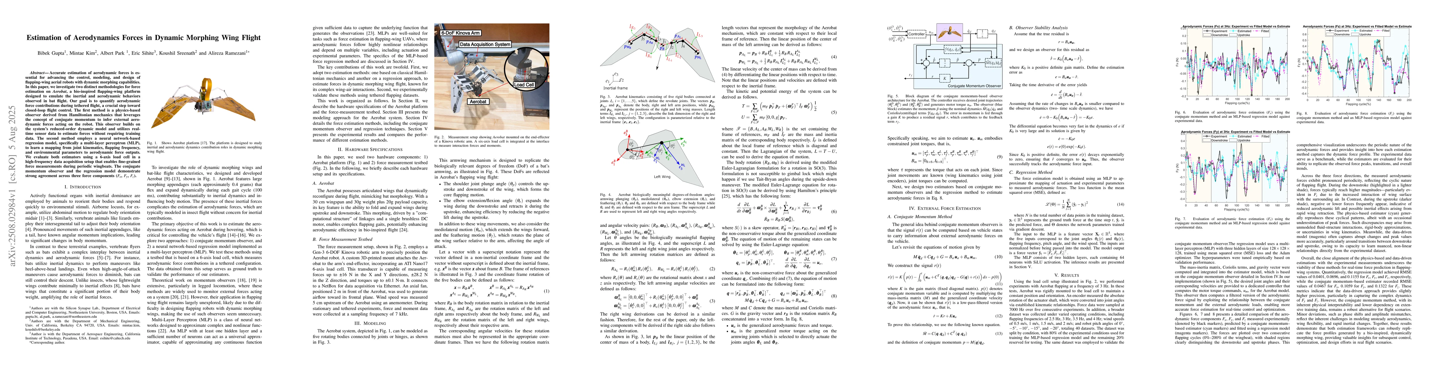 Accurate estimation of aerodynamic forces is essential for advancing the control, modeling, and design of flapping-wing aerial robots with dynamic morphing capabilities. In this paper, we investigate two distinct methodologies for force estimation on Aerobat, a bio-inspired flapping-wing platform designed to emulate the inertial and aerodynamic behaviors observed in bat flight. Our goal is to quantify aerodynamic force contributions during tethered flight, a crucial step toward closed-loop flight control. The first method is a physics-based observer derived from Hamiltonian mechanics that leverages the concept of conjugate momentum to infer external aerodynamic forces acting on the robot. This observer builds on the system's reduced-order dynamic model and utilizes real-time sensor data to estimate forces without requiring training data. The second method employs a neural network-based regression model, specifically a multi-layer perceptron (MLP), to learn a mapping from joint kinematics, flapping frequency, and environmental parameters to aerodynamic force outputs. We evaluate both estimators using a 6-axis load cell in a high-frequency data acquisition setup that enables fine-grained force measurements during periodic wingbeats. The conjugate momentum observer and the regression model demonstrate strong agreement across three force components (Fx, Fy, Fz).