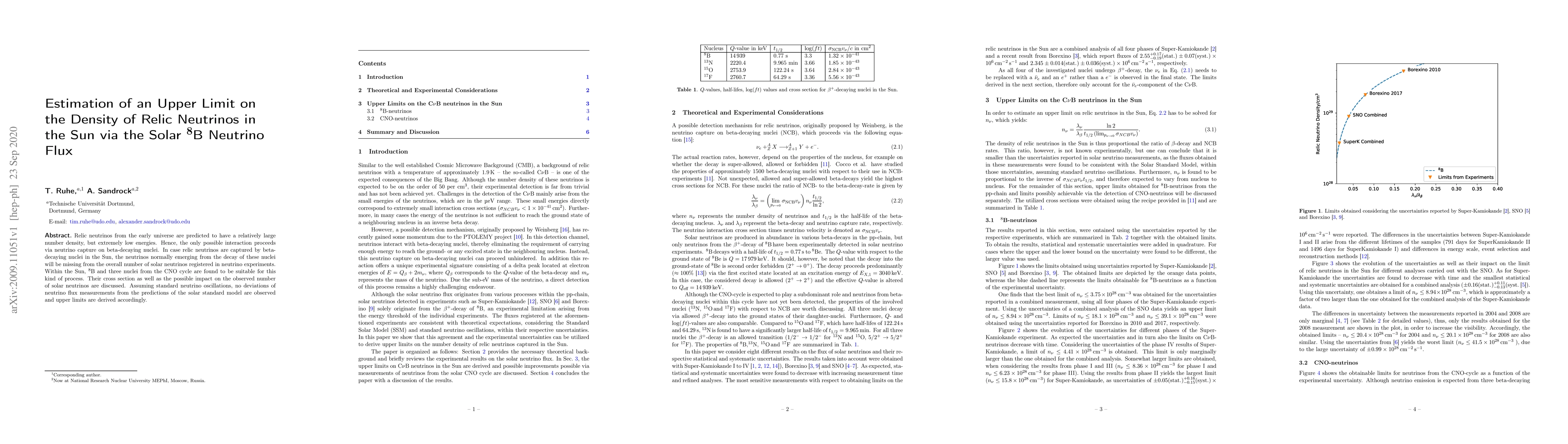 This paper estimates an upper limit on the density of relic neutrinos in the Sun by analyzing the solar $^8\mathrm{B}$ neutrino flux. The study considers the interaction of relic neutrinos via capture on beta-decaying nuclei, which could reduce the number of detected solar neutrinos, and derives upper limits based on observed neutrino flux measurements.