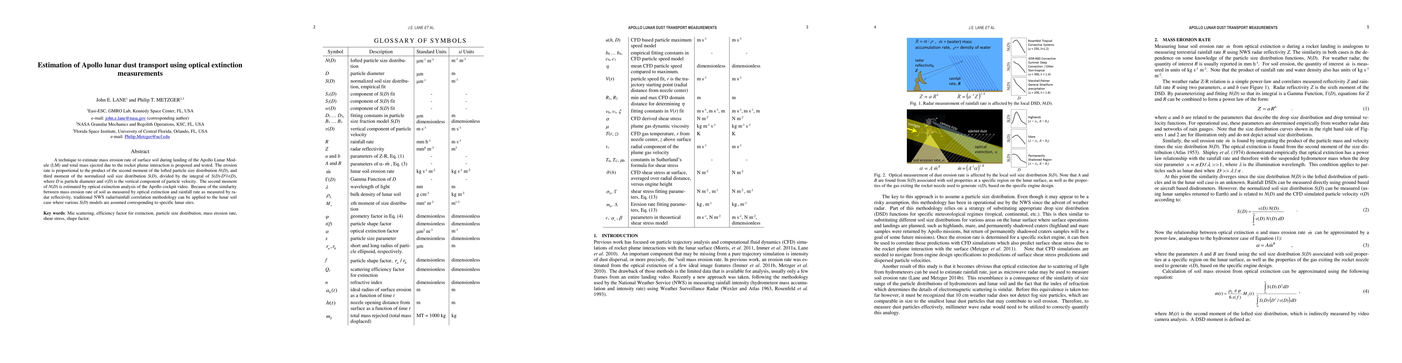 This paper proposes a method to estimate the mass erosion rate of lunar soil during Apollo Lunar Module landings using optical extinction analysis of cockpit videos. The method correlates the mass erosion rate with the second moment of particle size distribution and applies traditional radar-rainfall correlation techniques to model lunar soil erosion.