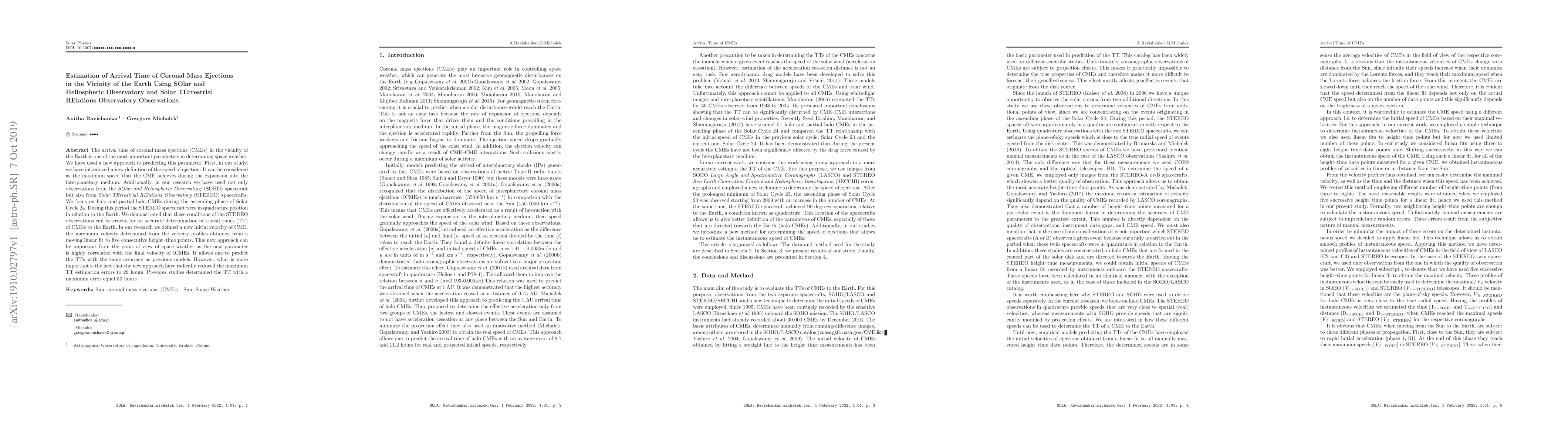 This study introduces a new method for estimating the arrival time of coronal mass ejections (CMEs) near Earth using observations from SOHO and STEREO spacecraft. The new approach defines the ejection speed as the maximum speed during CME expansion, significantly improving the accuracy of transit time predictions to within 29 hours, compared to previous models' 50-hour maximum error.