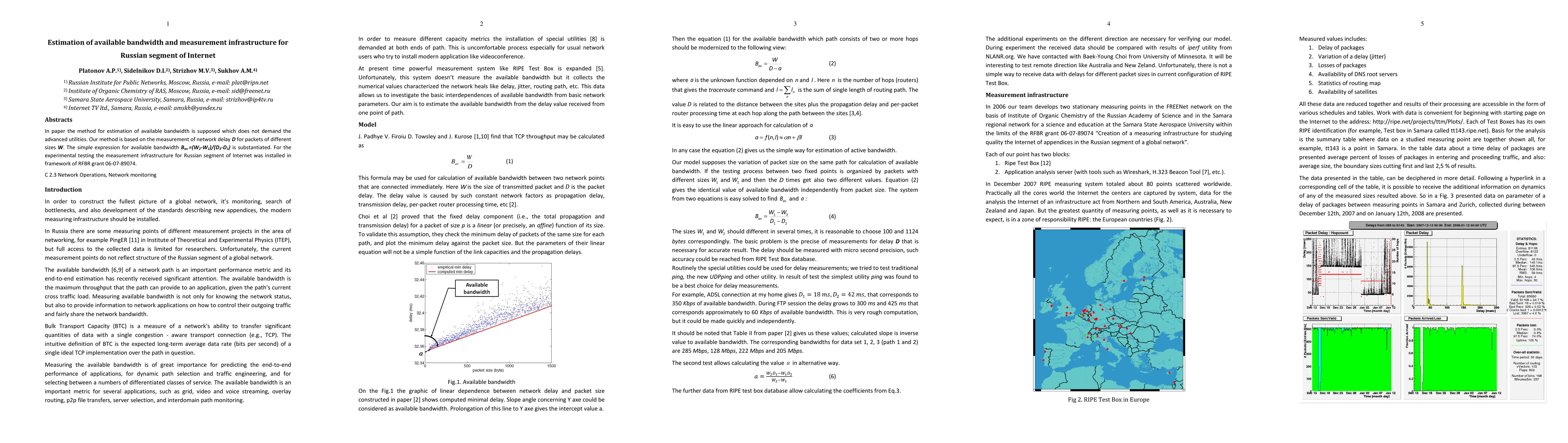In paper the method for estimation of available bandwidth is supposed which does not demand the advanced utilities. Our method is based on the measurement of network delay $D$ for packets of different sizes $W$. The simple expression for available bandwidth $B_{av} =(W_2-W_1)/(D_2-D_1)$ is substantiated. For the experimental testing the measurement infrastructure for Russian segment of Internet was installed in framework of RFBR grant 06-07-89074.