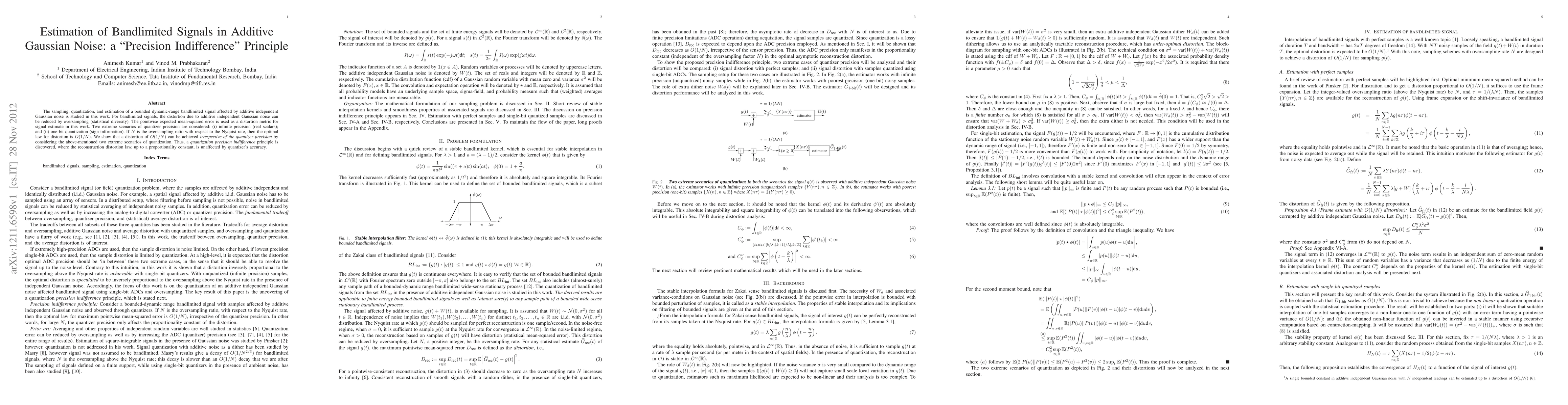 The sampling, quantization, and estimation of a bounded dynamic-range bandlimited signal affected by additive independent Gaussian noise is studied in this work. For bandlimited signals, the distortion due to additive independent Gaussian noise can be reduced by oversampling (statistical diversity). The pointwise expected mean-squared error is used as a distortion metric for signal estimate in this work. Two extreme scenarios of quantizer precision are considered: (i) infinite precision (real scalars); and (ii) one-bit quantization (sign information). If $N$ is the oversampling ratio with respect to the Nyquist rate, then the optimal law for distortion is $O(1/N)$. We show that a distortion of $O(1/N)$ can be achieved irrespective of the quantizer precision by considering the above-mentioned two extreme scenarios of quantization. Thus, a quantization precision indifference principle is discovered, where the reconstruction distortion law, up to a proportionality constant, is unaffected by quantizer's accuracy.