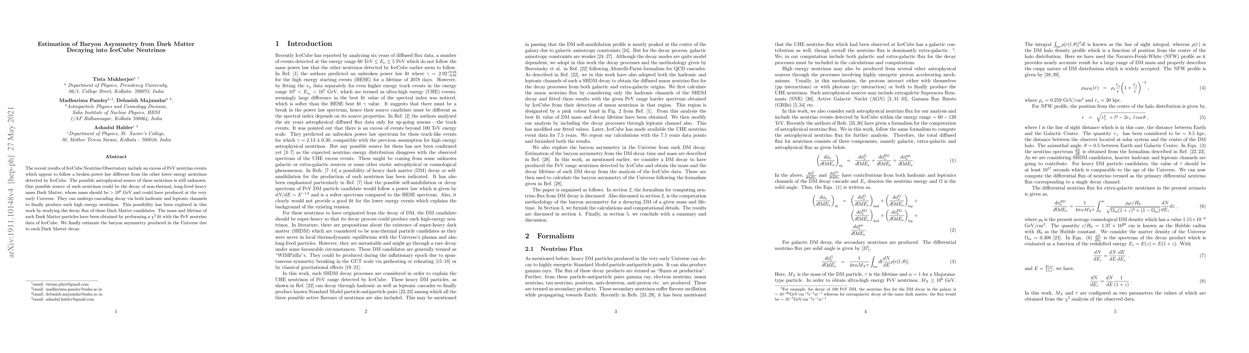 This paper investigates whether the high-energy PeV neutrino events detected by IceCube could originate from the decay of non-thermal, long-lived dark matter particles. By fitting the decay flux of these dark matter candidates to the observed neutrino data, the study estimates the baryon asymmetry in the Universe resulting from such decays.