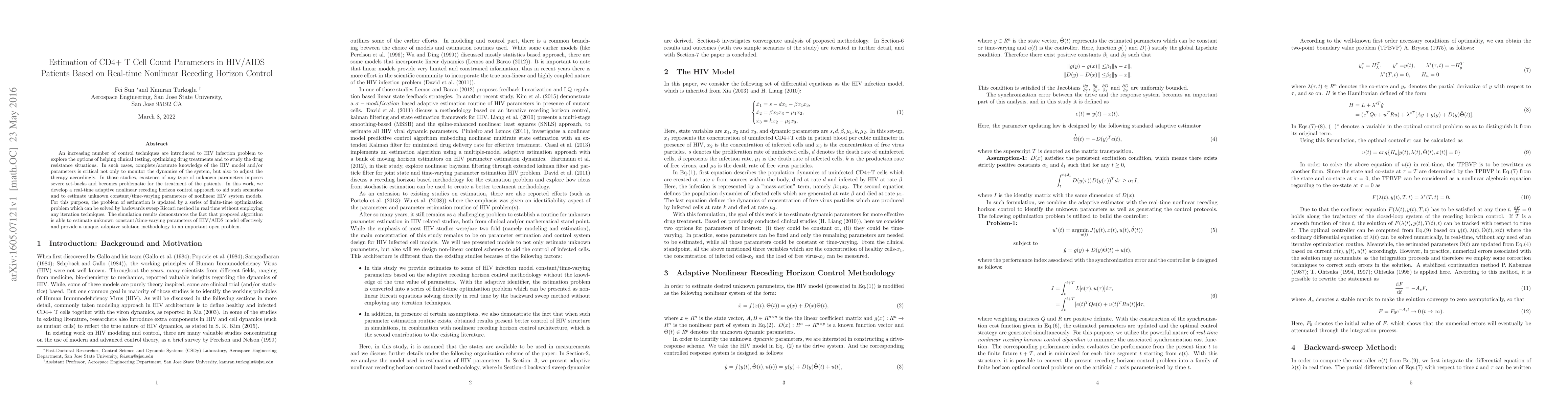 An increasing number of control techniques are introduced to HIV infection problem to explore the options of helping clinical testing, optimizing drug treatments and to study the drug resistance situations. In such cases, complete/accurate knowledge of the HIV model and/or parameters is critical not only to monitor the dynamics of the system, but also to adjust the therapy accordingly. In those studies, existence of any type of unknown parameters imposes severe set-backs and becomes problematic for the treatment of the patients. In this work, we develop a real-time adaptive nonlinear receding horizon control approach to aid such scenarios and to estimate unknown constant/time-varying parameters of nonlinear HIV system models. For this purpose, the problem of estimation is updated by a series of finite-time optimization problem which can be solved by backwards sweep Riccati method in real time without employing any iteration techniques. The simulation results demonstrates the fact that proposed algorithm is able to estimate unknown constant/time-varying parameters of HIV/AIDS model effectively and provide a unique, adaptive solution methodology to an important open problem.