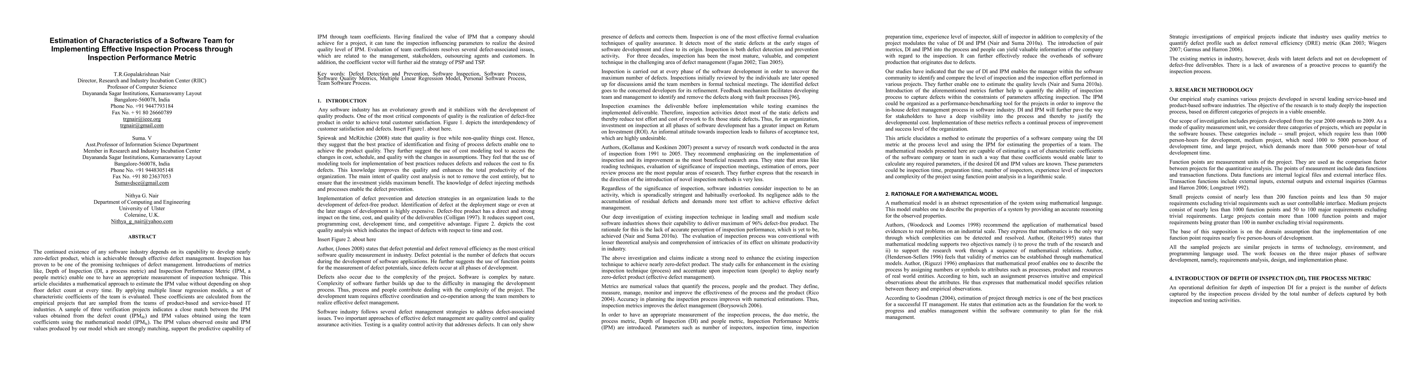 The continued existence of any software industry depends on its capability to develop nearly zero-defect product, which is achievable through effective defect management. Inspection has proven to be one of the promising techniques of defect management. Introductions of metrics like, Depth of Inspection (DI, a process metric) and Inspection Performance Metric (IPM, a people metric) enable one to have an appropriate measurement of inspection technique. This article elucidates a mathematical approach to estimate the IPM value without depending on shop floor defect count at every time. By applying multiple linear regression models, a set of characteristic coefficients of the team is evaluated. These coefficients are calculated from the empirical projects that are sampled from the teams of product-based and service-based IT industries. A sample of three verification projects indicates a close match between the IPM values obtained from the defect count (IPMdc) and IPM values obtained using the team coefficients using the mathematical model (IPMtc). The IPM values observed onsite and IPM values produced by our model which are strongly matching, support the predictive capability of IPM through team coefficients. Having finalized the value of IPM that a company should achieve for a project, it can tune the inspection influencing parameters to realize the desired quality level of IPM. Evaluation of team coefficients resolves several defect-associated issues, which are related to the management, stakeholders, outsourcing agents and customers. In addition, the coefficient vector will further aid the strategy of PSP and TSP