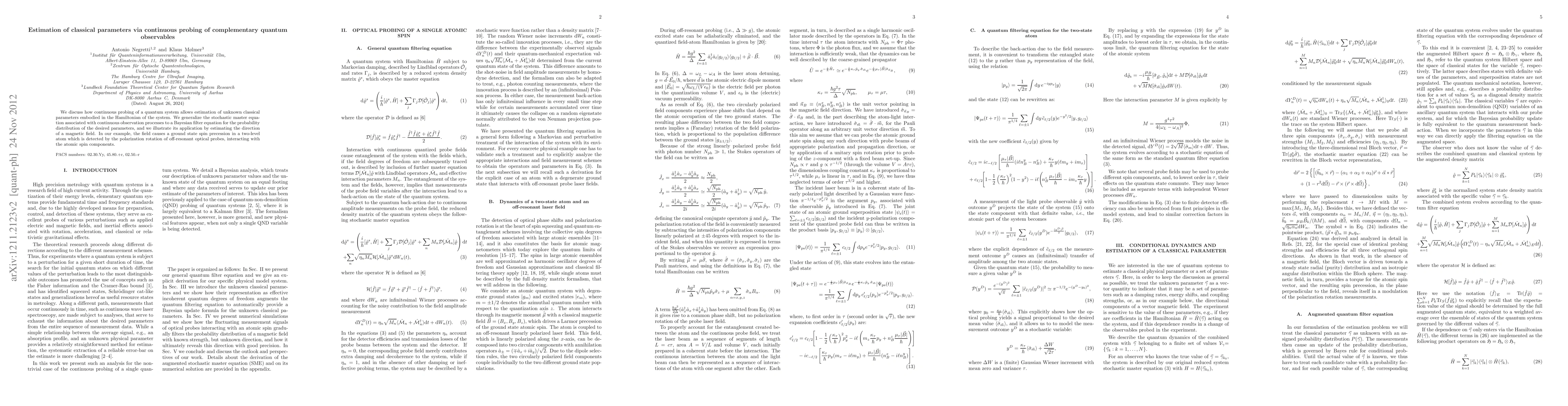 We discuss how continuous probing of a quantum system allows estimation of unknown classical parameters embodied in the Hamiltonian of the system. We generalize the stochastic master equation associated with continuous observation processes to a Bayesian filter equation for the probability distribution of the desired parameters, and we illustrate its application by estimating the direction of a magnetic field. In our example, the field causes a ground state spin precession in a two-level atom which is detected by the polarization rotation of off-resonant optical probes, interacting with the atomic spin components.