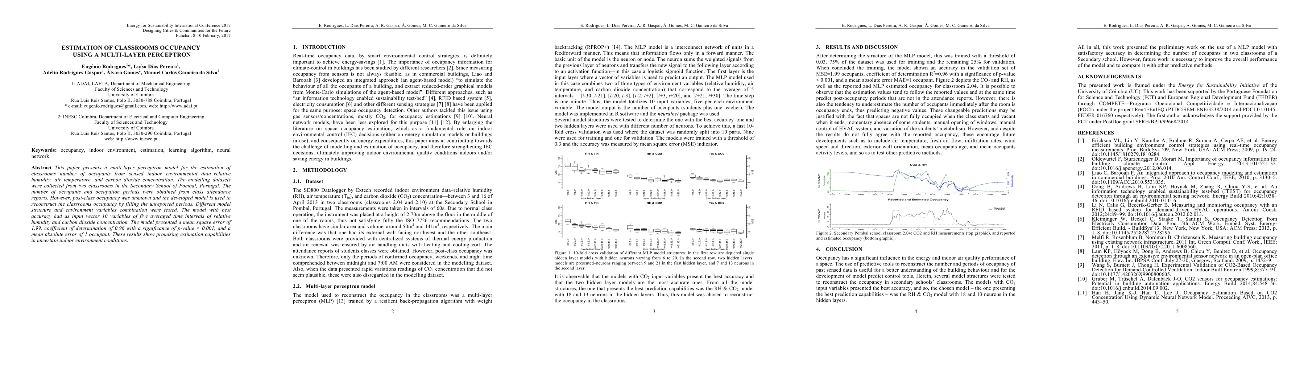 This paper presents a multi-layer perceptron model for the estimation of classrooms number of occupants from sensed indoor environmental data-relative humidity, air temperature, and carbon dioxide concentration. The modelling datasets were collected from two classrooms in the Secondary School of Pombal, Portugal. The number of occupants and occupation periods were obtained from class attendance reports. However, post-class occupancy was unknown and the developed model is used to reconstruct the classrooms occupancy by filling the unreported periods. Different model structure and environment variables combination were tested. The model with best accuracy had as input vector 10 variables of five averaged time intervals of relative humidity and carbon dioxide concentration. The model presented a mean square error of 1.99, coefficient of determination of 0.96 with a significance of p-value < 0.001, and a mean absolute error of 1 occupant. These results show promising estimation capabilities in uncertain indoor environment conditions.