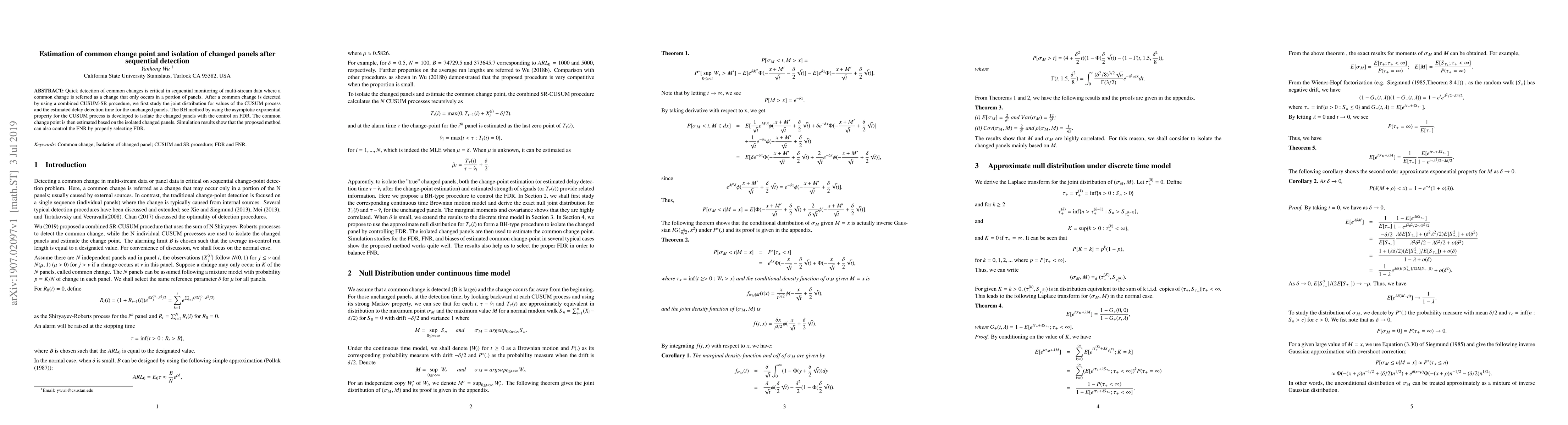 This research proposes a method to detect and estimate a common change point in multi-stream data using a combined CUSUM-SR procedure. It introduces a BH method to isolate changed panels with False Discovery Rate (FDR) control, and demonstrates through simulations that this approach can also manage False Negative Rate (FNR) by selecting FDR appropriately.