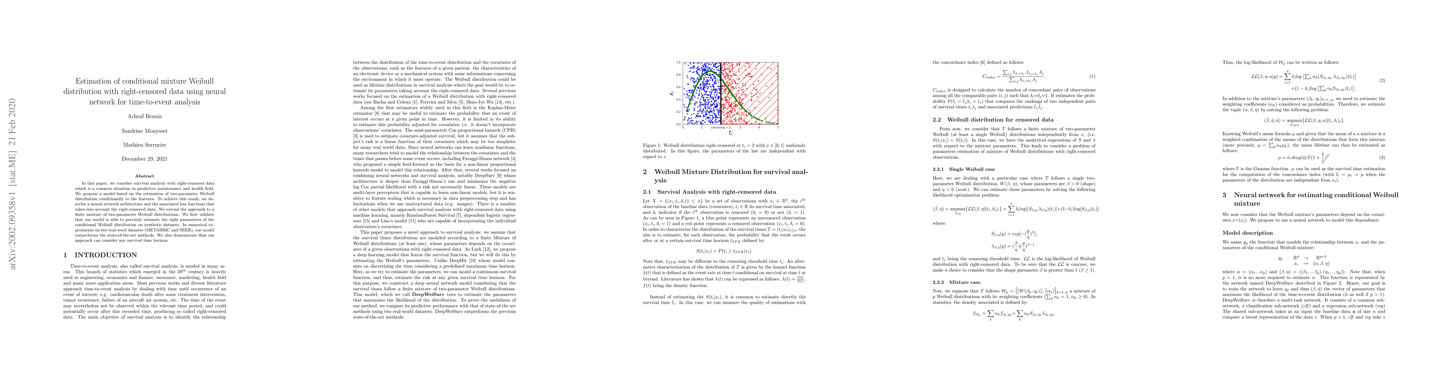 This paper proposes a neural network model for estimating a conditional mixture Weibull distribution in survival analysis with right-censored data, showing improved performance over existing methods on synthetic and real-world datasets. The model effectively handles censored data and can accommodate any survival time horizon.