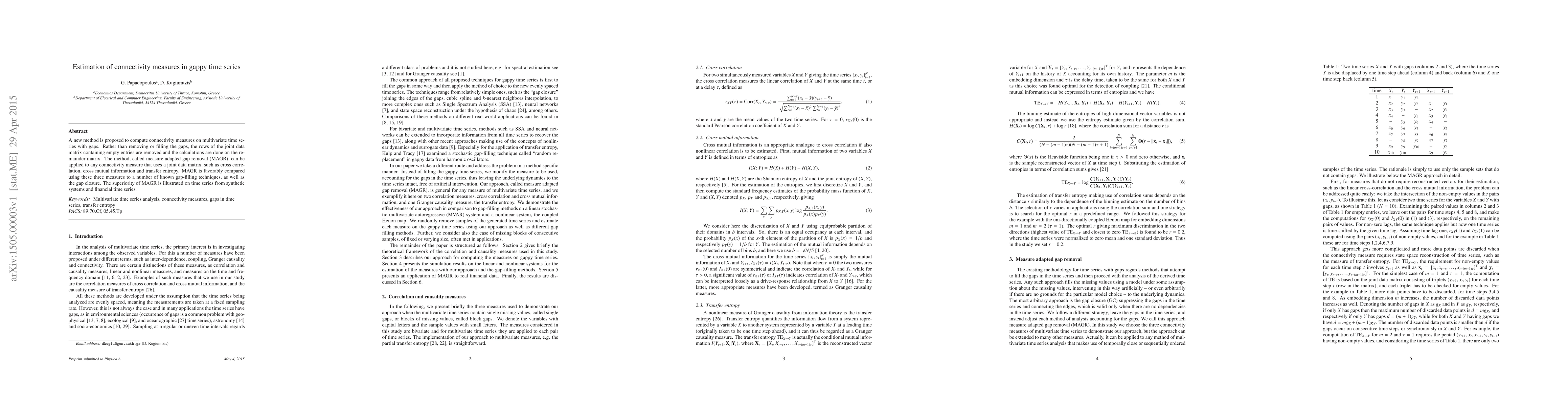 The paper introduces a new method called measure adapted gap removal (MAGR) to compute connectivity measures on multivariate time series with gaps, avoiding gap-filling or removal by excluding rows with empty entries. MAGR is shown to outperform traditional gap-filling techniques and gap closure methods across synthetic and financial time series data.