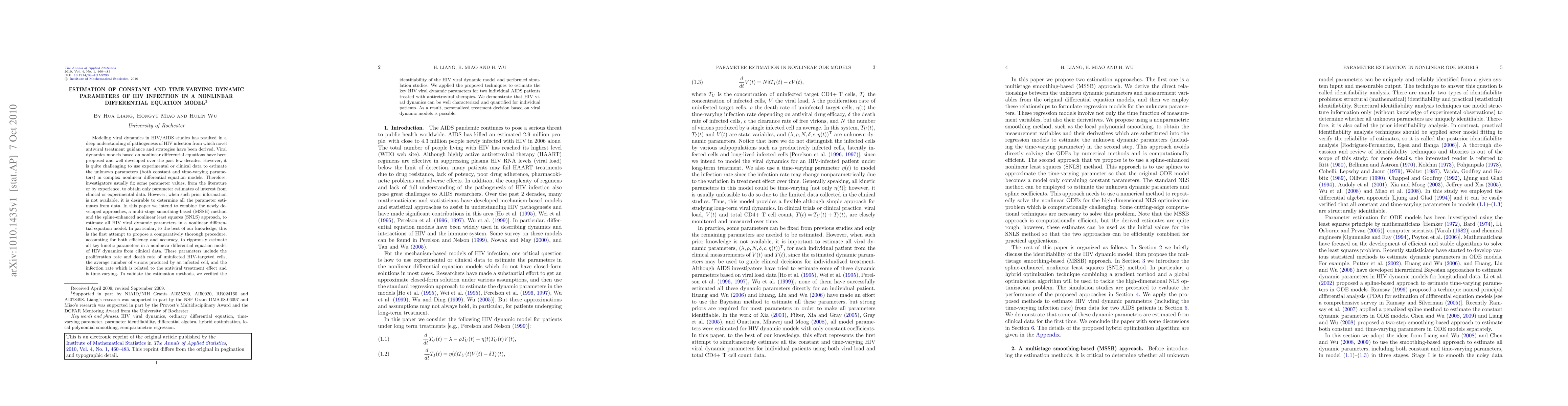 This paper proposes a novel method combining multi-stage smoothing-based (MSSB) and spline-enhanced nonlinear least squares (SNLS) approaches to estimate all dynamic parameters in a nonlinear differential equation model of HIV infection, including constant and time-varying factors. The study validates the method's effectiveness through identifiability verification and simulation studies.