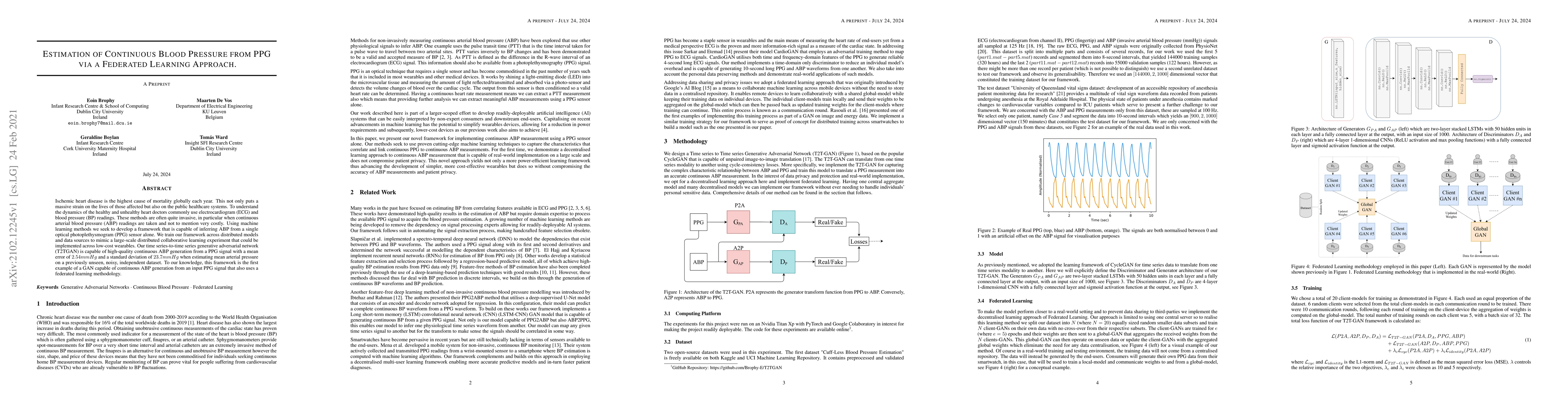 Ischemic heart disease is the highest cause of mortality globally each year. This not only puts a massive strain on the lives of those affected but also on the public healthcare systems. To understand the dynamics of the healthy and unhealthy heart doctors commonly use electrocardiogram (ECG) and blood pressure (BP) readings. These methods are often quite invasive, in particular when continuous arterial blood pressure (ABP) readings are taken and not to mention very costly. Using machine learning methods we seek to develop a framework that is capable of inferring ABP from a single optical photoplethysmogram (PPG) sensor alone. We train our framework across distributed models and data sources to mimic a large-scale distributed collaborative learning experiment that could be implemented across low-cost wearables. Our time series-to-time series generative adversarial network (T2TGAN) is capable of high-quality continuous ABP generation from a PPG signal with a mean error of 2.54 mmHg and a standard deviation of 23.7 mmHg when estimating mean arterial pressure on a previously unseen, noisy, independent dataset. To our knowledge, this framework is the first example of a GAN capable of continuous ABP generation from an input PPG signal that also uses a federated learning methodology.