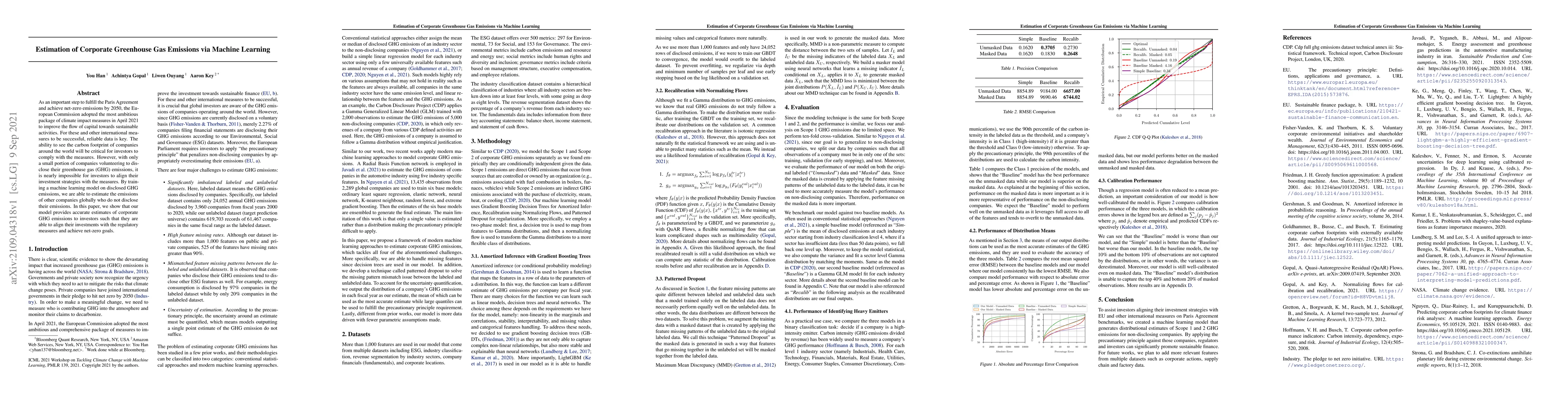 As an important step to fulfill the Paris Agreement and achieve net-zero emissions by 2050, the European Commission adopted the most ambitious package of climate impact measures in April 2021 to improve the flow of capital towards sustainable activities. For these and other international measures to be successful, reliable data is key. The ability to see the carbon footprint of companies around the world will be critical for investors to comply with the measures. However, with only a small portion of companies volunteering to disclose their greenhouse gas (GHG) emissions, it is nearly impossible for investors to align their investment strategies with the measures. By training a machine learning model on disclosed GHG emissions, we are able to estimate the emissions of other companies globally who do not disclose their emissions. In this paper, we show that our model provides accurate estimates of corporate GHG emissions to investors such that they are able to align their investments with the regulatory measures and achieve net-zero goals.