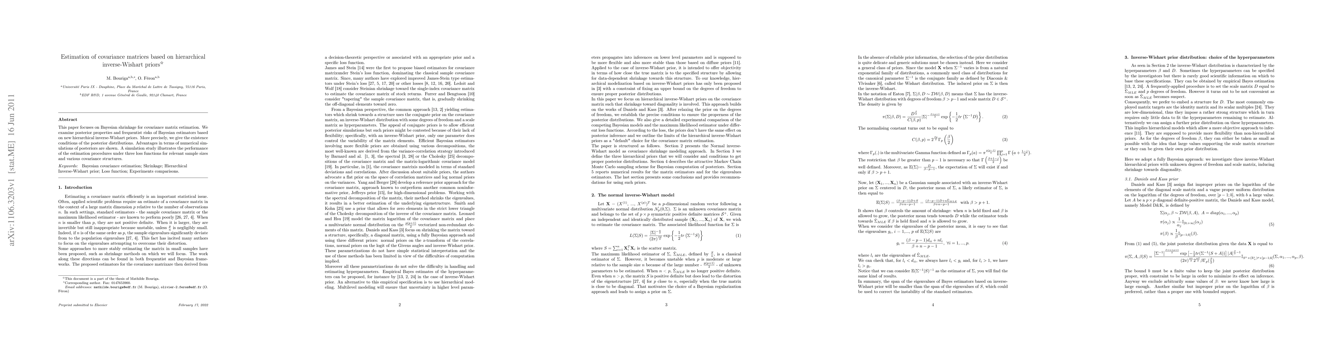 This paper proposes Bayesian shrinkage methods for covariance matrix estimation using hierarchical inverse-Wishart priors, demonstrating their posterior properties and frequentist risks through numerical simulations and a simulation study under different loss functions and sample sizes.