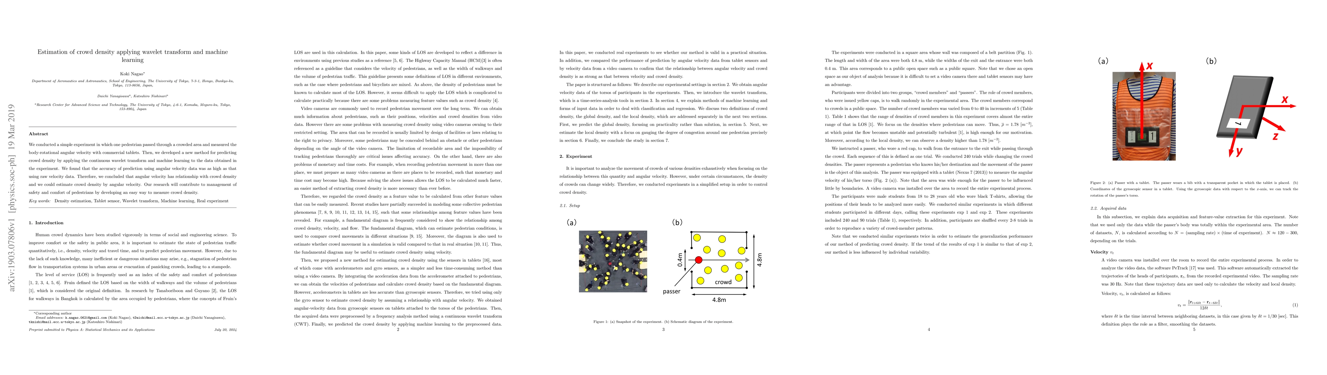 We conducted a simple experiment in which one pedestrian passed through a crowded area and measured the body-rotational angular velocity with commercial tablets. Then, we developed a new method for predicting crowd density by applying the continuous wavelet transform and machine learning to the data obtained in the experiment. We found that the accuracy of prediction using angular velocity data was as high as that using raw velocity data. Therefore, we concluded that angular velocity has relationship with crowd density and we could estimate crowd density by angular velocity. Our research will contribute to management of safety and comfort of pedestrians by developing an easy way to measure crowd density.