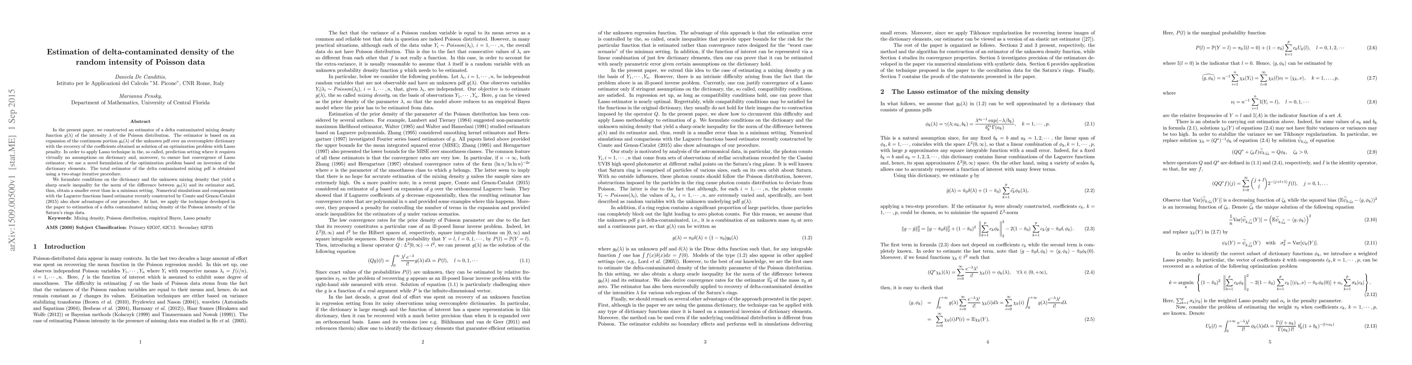 In the present paper, we constructed an estimator of a delta contaminated mixing density function $g(\lambda)$ of the intensity $\lambda$ of the Poisson distribution. The estimator is based on an expansion of the continuous portion $g_0(\lambda)$ of the unknown pdf over an overcomplete dictionary with the recovery of the coefficients obtained as solution of an optimization problem with Lasso penalty. In order to apply Lasso technique in the, so called, prediction setting where it requires virtually no assumptions on dictionary and, moreover, to ensure fast convergence of Lasso estimator, we use a novel formulation of the optimization problem based on inversion of the dictionary elements. The total estimator of the delta contaminated mixing pdf is obtained using a two-stage iterative procedure. We formulate conditions on the dictionary and the unknown mixing density that yield a sharp oracle inequality for the norm of the difference between $g_0 (\lambda)$ and its estimator and, thus, obtain a smaller error than in a minimax setting. Numerical simulations and comparisons with the Laguerre functions based estimator recently constructed by Comte and Genon-Catalot (2015) also show advantages of our procedure. At last, we apply the technique developed in the paper to estimation of a delta contaminated mixing density of the Poisson intensity of the Saturn's rings data.