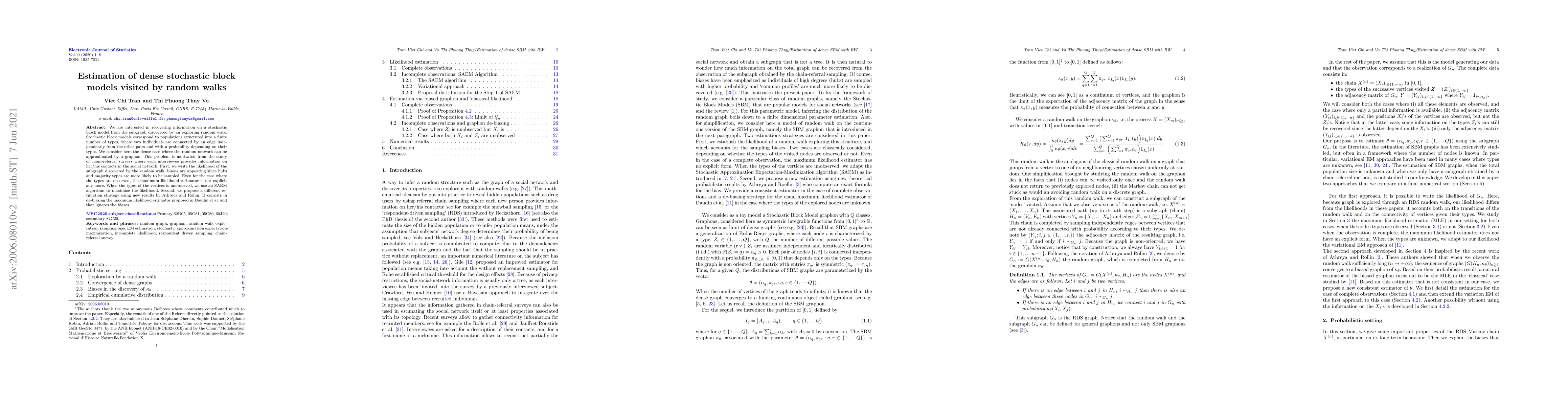 We are interested in recovering information on a stochastic block model from the subgraph discovered by an exploring random walk. Stochastic block models correspond to populations structured into a finite number of types, where two individuals are connected by an edge independently from the other pairs and with a probability depending on their types. We consider here the dense case where the random network can be approximated by a graphon. This problem is motivated from the study of chain-referral surveys where each interviewee provides information on her/his contacts in the social network. First, we write the likelihood of the subgraph discovered by the random walk: biases are appearing since hubs and majority types are more likely to be sampled. Even for the case where the types are observed, the maximum likelihood estimator is not explicit any more. When the types of the vertices is unobserved, we use an SAEM algorithm to maximize the likelihood. Second, we propose a different estimation strategy using new results by Athreya and Roellin. It consists in de-biasing the maximum likelihood estimator proposed in Daudin et al. and that ignores the biases.