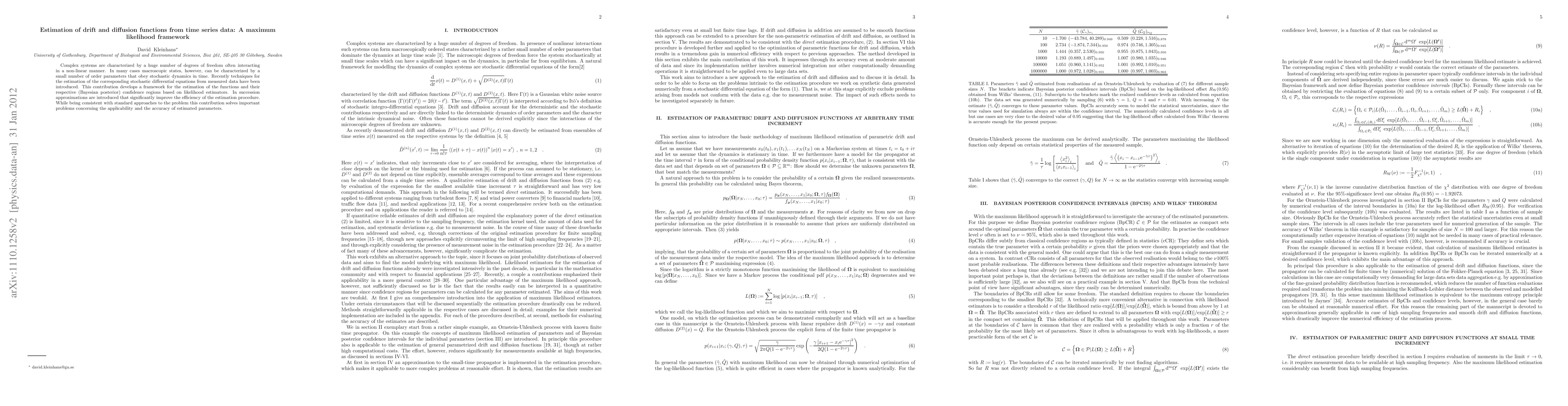 This paper develops a framework for estimating drift and diffusion functions from time series data using maximum likelihood estimators, improving the efficiency of estimation procedures and providing Bayesian posterior confidence regions.