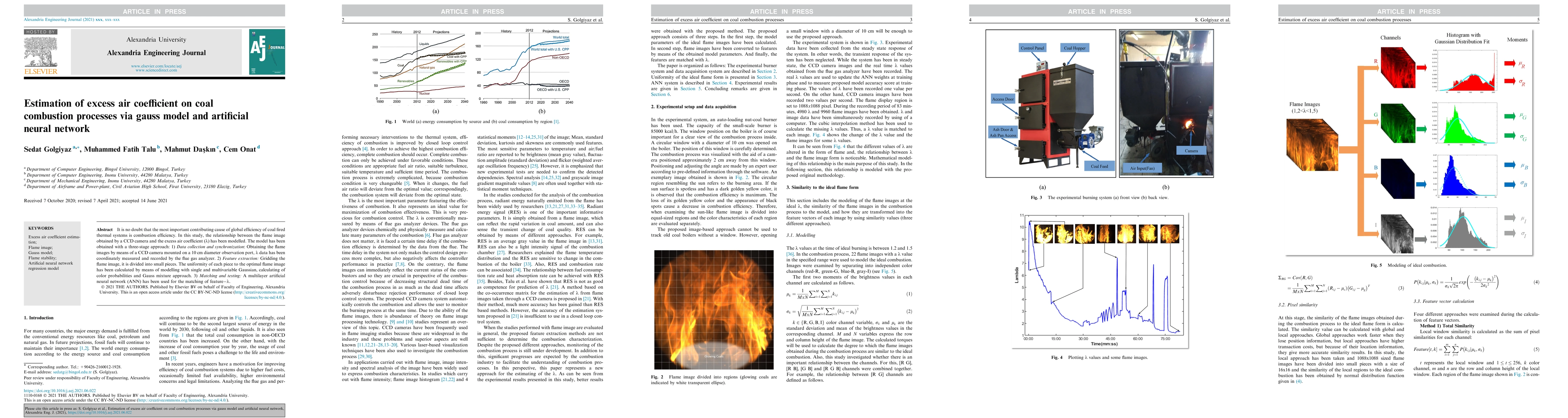 It is no doubt that the most important contributing cause of global efficiency of coal fired thermal systems is combustion efficiency. In this study, the relationship between the flame image obtained by a CCD camera and the excess air coefficient ({\lambda}) has been modelled. The model has been obtained with a three-stage approach: 1) Data collection and synchronization: Obtaining the flame images by means of a CCD camera mounted on a 10 cm diameter observation port, {\lambda} data has been coordinately measured and recorded by the flue gas analyzer. 2) Feature extraction: Gridding the flame image, it is divided into small pieces. The uniformity of each piece to the optimal flame image has been calculated by means of modelling with single and multivariable Gaussian, calculating of color probabilities and Gauss mixture approach. 3) Matching and testing: A multilayer artificial neural network (ANN) has been used for the matching of feature-{\lambda}.
