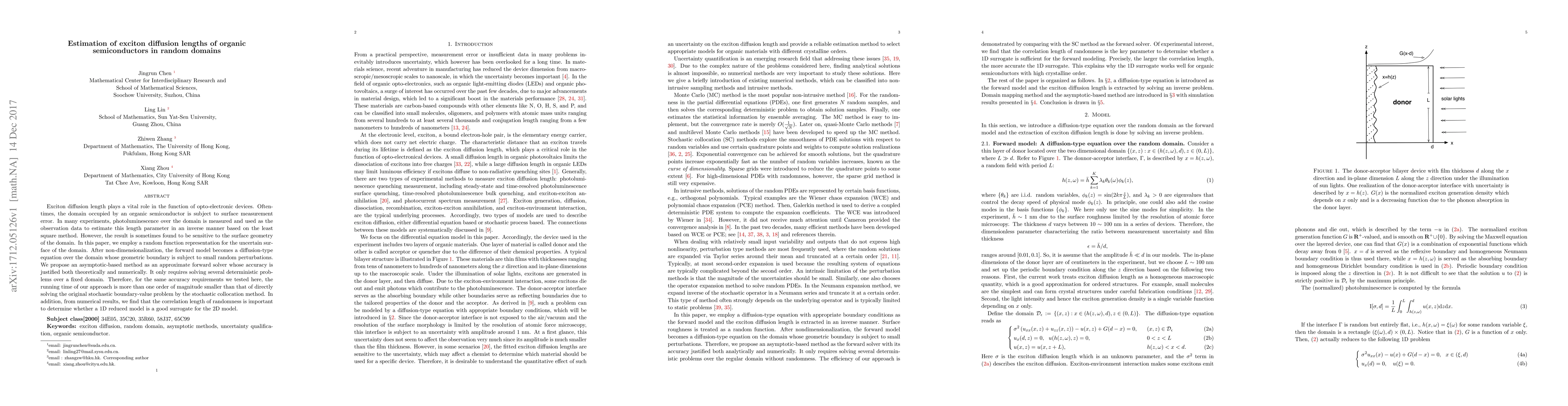 Exciton diffusion length plays a vital role in the function of opto-electronic devices. Oftentimes, the domain occupied by an organic semiconductor is subject to surface measurement error. In many experiments, photoluminescence over the domain is measured and used as the observation data to estimate this length parameter in an inverse manner based on the least square method. However, the result is sometimes found to be sensitive to the surface geometry of the domain. In this paper, we employ a random function representation for the uncertain surface of the domain. After non-dimensionalization, the forward model becomes a diffusion-type equation over the domain whose geometric boundary is subject to small random perturbations. We propose an asymptotic-based method as an approximate forward solver whose accuracy is justified both theoretically and numerically. It only requires solving several deterministic problems over a fixed domain. Therefore, for the same accuracy requirements we tested here, the running time of our approach is more than one order of magnitude smaller than that of directly solving the original stochastic boundary-value problem by the stochastic collocation method. In addition, from numerical results, we find that the correlation length of randomness is important to determine whether a 1D reduced model is a good surrogate for the 2D model.