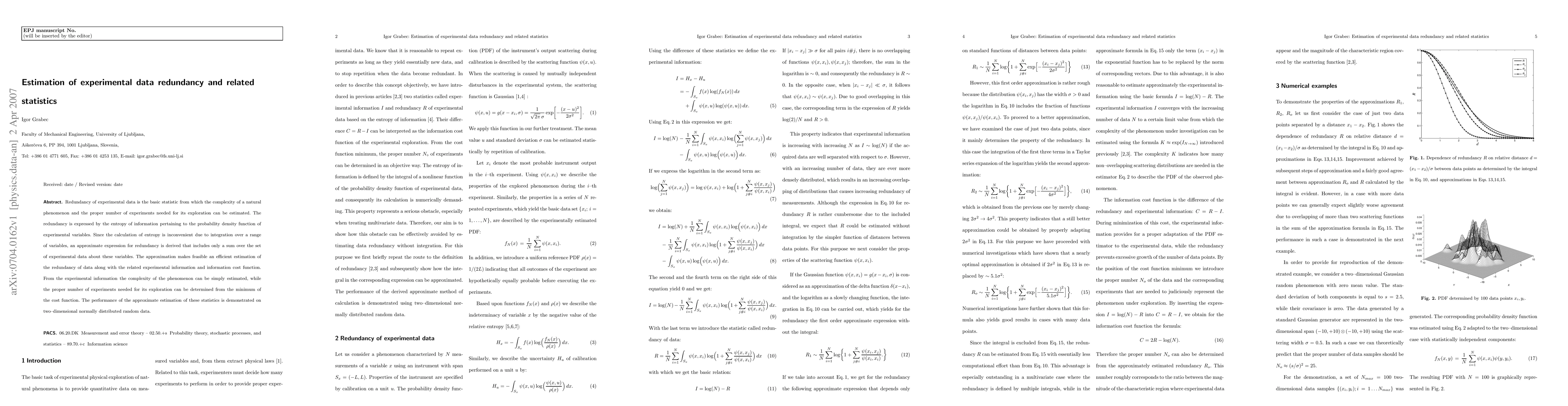 Redundancy of experimental data is the basic statistic from which the complexity of a natural phenomenon and the proper number of experiments needed for its exploration can be estimated. The redundancy is expressed by the entropy of information pertaining to the probability density function of experimental variables. Since the calculation of entropy is inconvenient due to integration over a range of variables, an approximate expression for redundancy is derived that includes only a sum over the set of experimental data about these variables. The approximation makes feasible an efficient estimation of the redundancy of data along with the related experimental information and information cost function. From the experimental information the complexity of the phenomenon can be simply estimated, while the proper number of experiments needed for its exploration can be determined from the minimum of the cost function. The performance of the approximate estimation of these statistics is demonstrated on two-dimensional normally distributed random data.