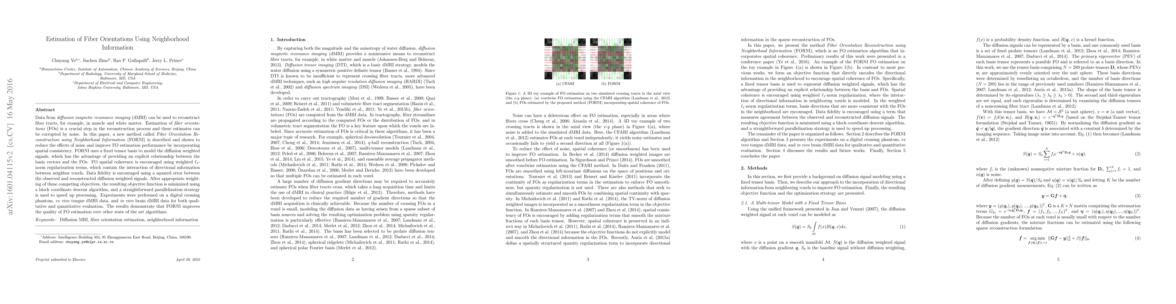 This paper introduces FORNI, a novel method for estimating fiber orientations in diffusion magnetic resonance imaging by incorporating spatial consistency and reducing noise. The method uses a fixed tensor basis and weighted l1-norm regularization to improve estimations, outperforming other algorithms in both qualitative and quantitative evaluations.