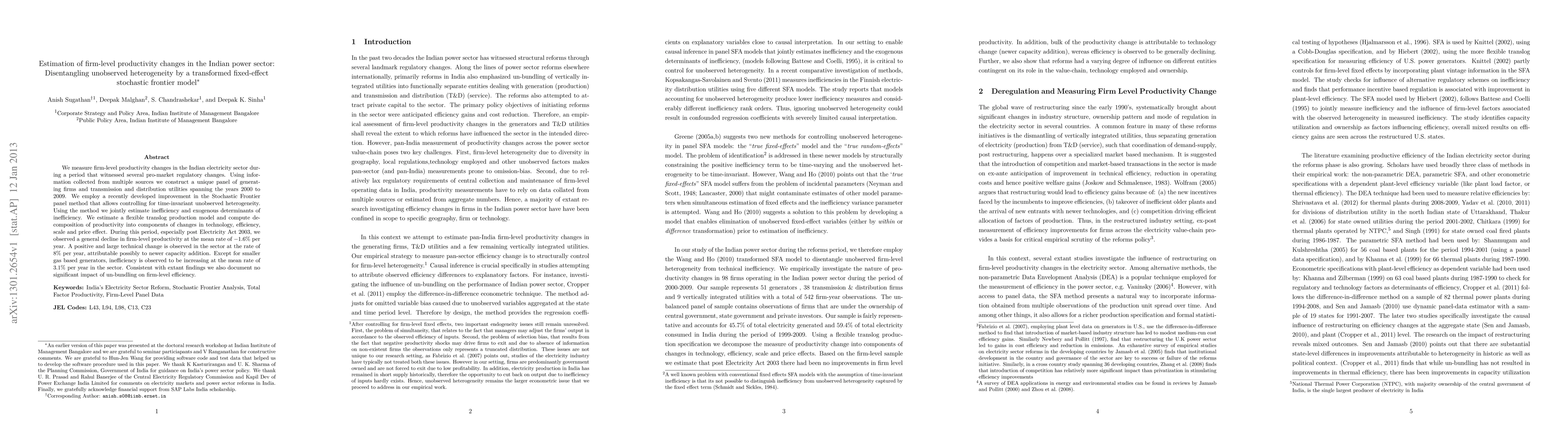 This paper estimates firm-level productivity changes in India's electricity sector from 2000 to 2009 using a transformed fixed-effect stochastic frontier model, revealing a decline in productivity and increasing inefficiency despite a positive technical change. The study finds a yearly average productivity decline of -1.6% and a 3.1% annual increase in inefficiency, while noting an 8% annual technical change likely due to capacity additions.