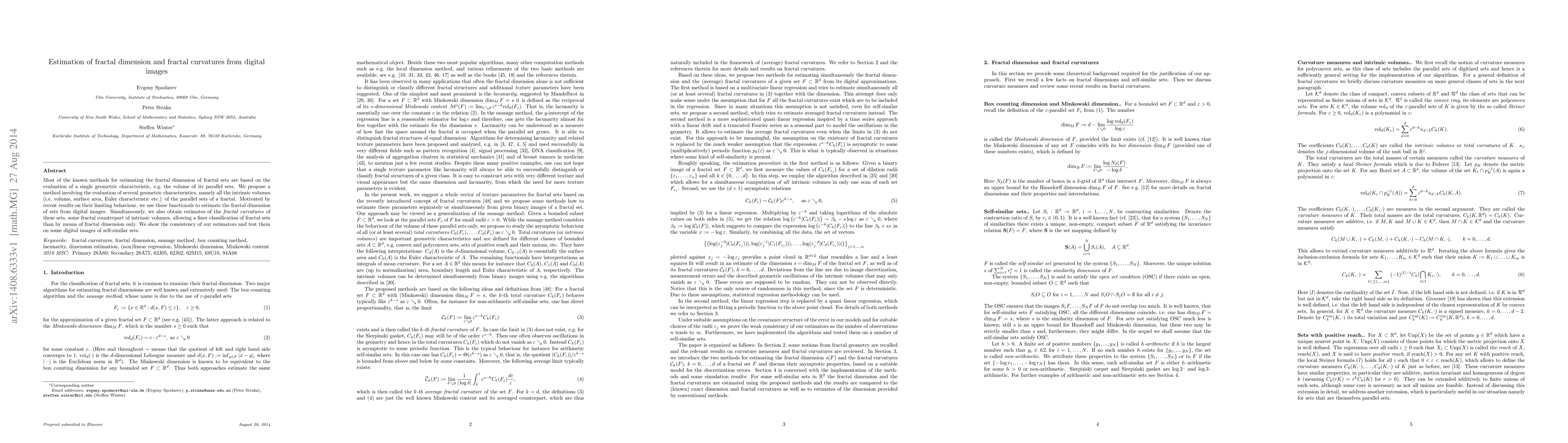 Most of the known methods for estimating the fractal dimension of fractal sets are based on the evaluation of a single geometric characteristic, e.g. the volume of its parallel sets. We propose a method involving the evaluation of several geometric characteristics, namely all the intrinsic volumes (i.e.\ volume, surface area, Euler characteristic etc.) of the parallel sets of a fractal. Motivated by recent results on their limiting behaviour, we use these functionals to estimate the fractal dimension of sets from digital images. Simultaneously, we also obtain estimates of the fractal curvatures of these sets, some fractal counterpart of intrinsic volumes, allowing a finer classification of fractal sets than by means of fractal dimension only. We show the consistency of our estimators and test them on some digital images of self-similar sets.