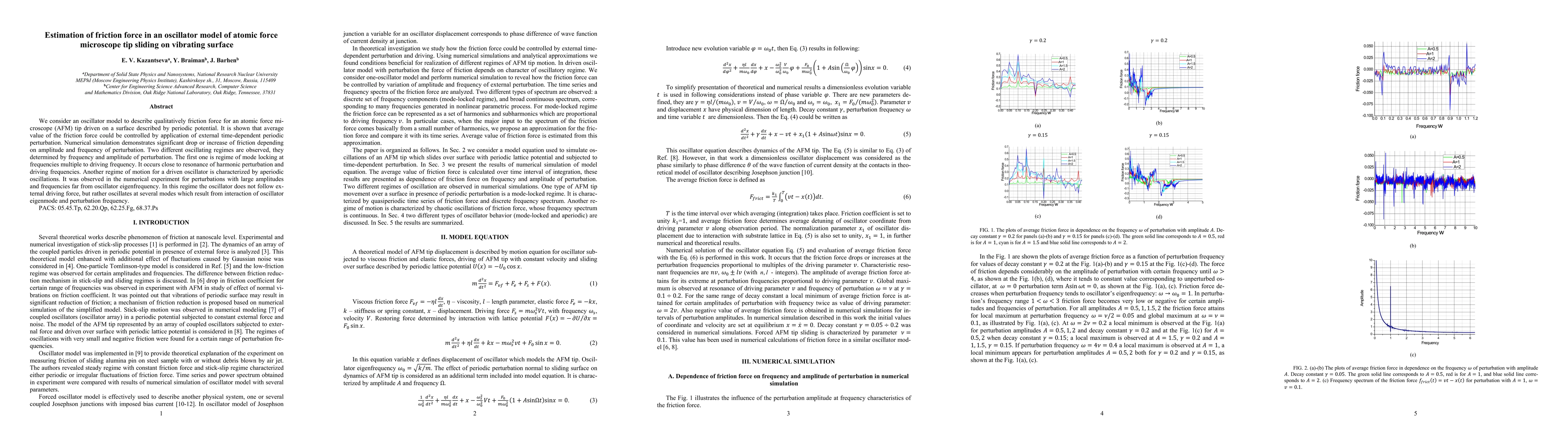 We consider an oscillator model to describe qualitatively friction force for an atomic force mi-croscope (AFM) tip driven on a surface described by periodic potential. It is shown that average value of the friction force could be controlled by application of external time-dependent periodic perturbation. Numerical simulation demonstrates significant drop or increase of friction depending on amplitude and frequency of perturbation. Two different oscillating regimes are observed, they determined by frequency and amplitude of perturbation. The first one is regime of mode locking at frequencies multiple to driving frequency. It occurs close to resonance of harmonic perturbation and driving frequencies. Another regime of motion for a driven oscillator is characterized by aperiodic oscillations. It was observed in the numerical experiment for perturbations with large amplitudes and frequencies far from oscillator eigenfrequency. In this regime the oscillator does not follow external driving force, but rather oscillates at several modes which result from interaction of oscillator eigenmode and perturbation frequency.