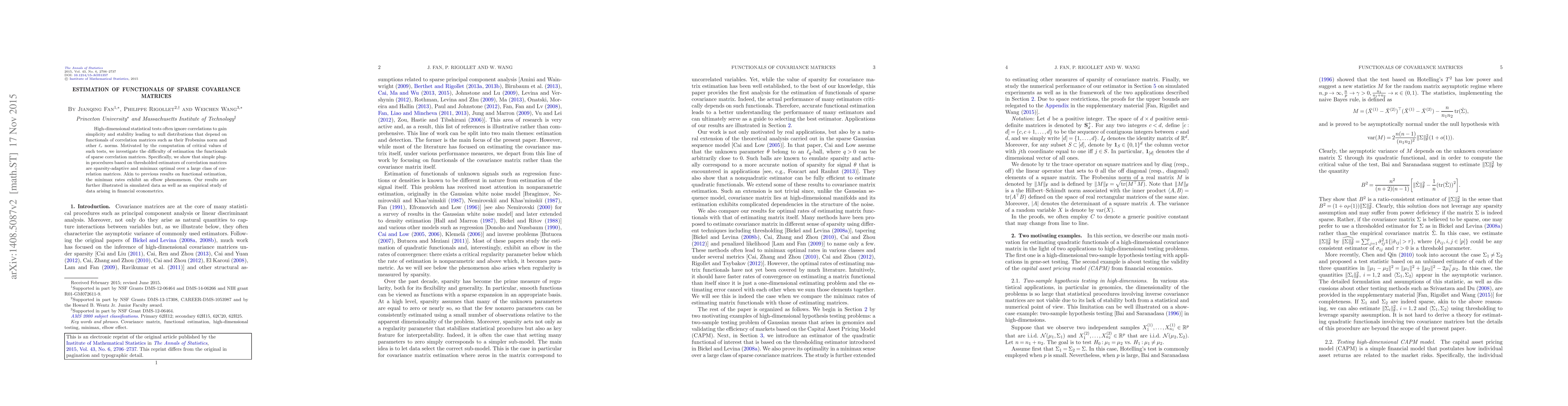 This paper investigates the estimation of functionals of sparse covariance matrices, demonstrating that simple thresholded estimators are both sparsity-adaptive and minimax optimal. The study highlights an "elbow phenomenon" in the minimax rates and validates the findings through simulations and an empirical analysis in financial econometrics.