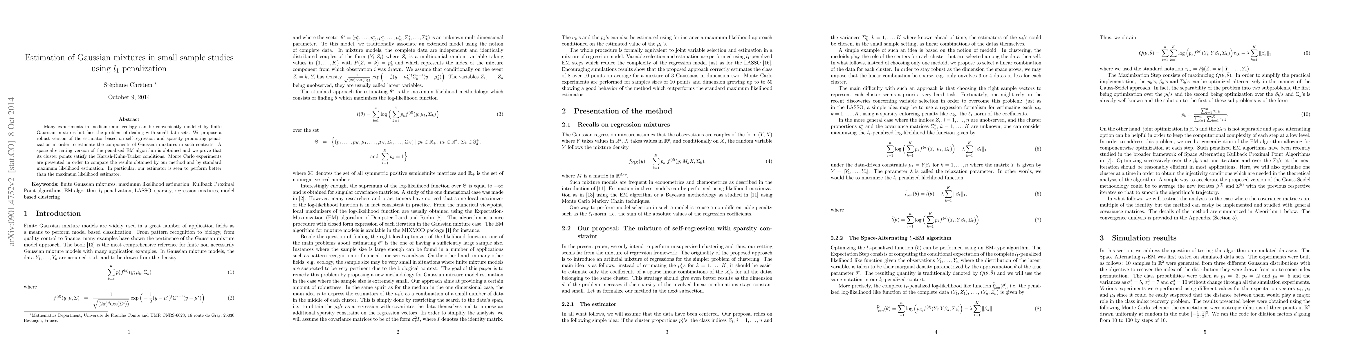 This paper proposes a robust estimator for Gaussian mixtures in small sample studies using $l_1$ penalization, based on self-regression and sparsity. The method is shown to outperform standard maximum likelihood estimation through Monte Carlo experiments.