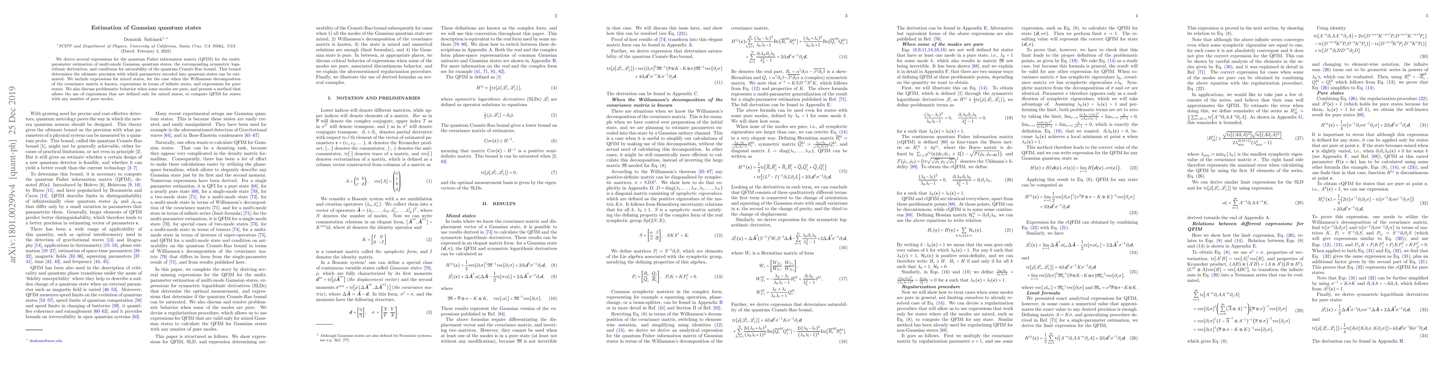 This paper derives expressions for the quantum Fisher information matrix for estimating parameters in multi-mode Gaussian quantum states, including mixed states and conditions for achieving the quantum Cramer-Rao bound. It also addresses issues with pure modes and provides a method to compute the QFIM for states with mixed and pure modes.