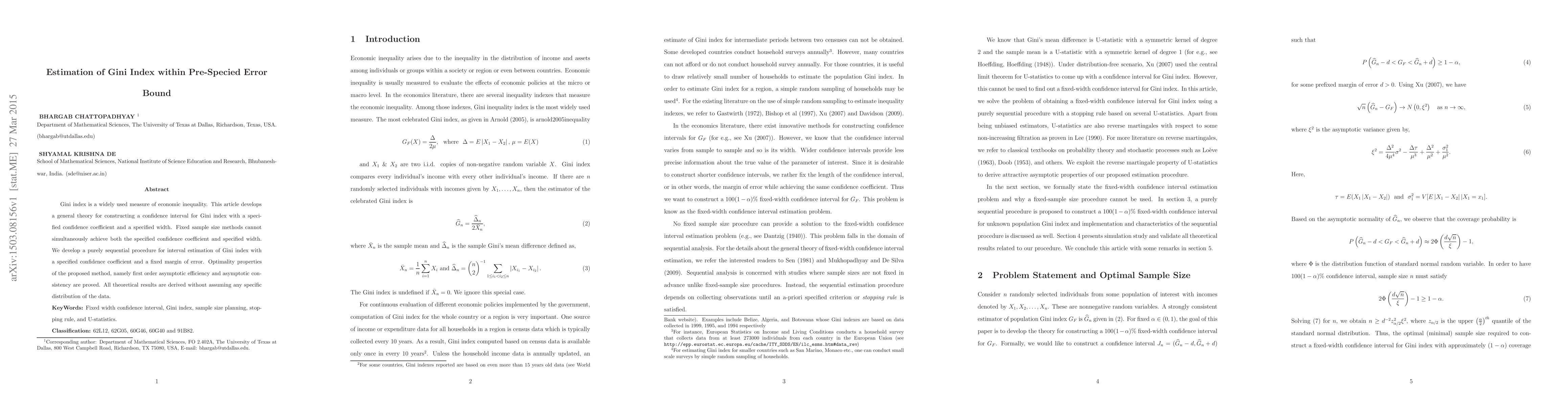 This paper develops a sequential procedure for estimating the Gini index with a specified confidence coefficient and a fixed margin of error, achieving first-order asymptotic efficiency and consistency. The method does not require assumptions about the data distribution.