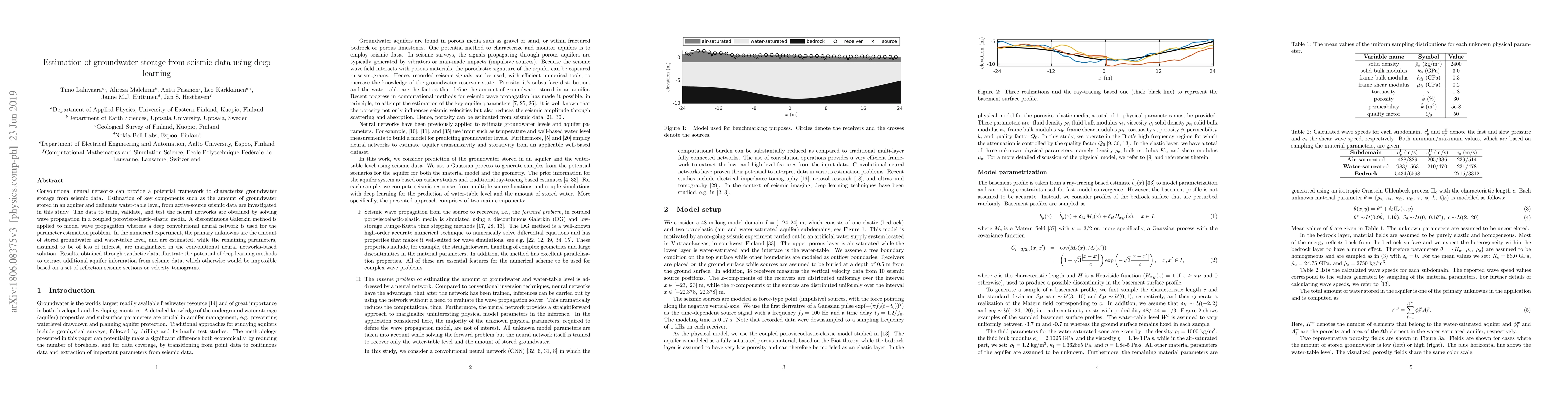 This study employs convolutional neural networks to estimate groundwater storage and delineate water-table levels from active-source seismic data. Using synthetic data generated by a discontinuous Galerkin method, deep learning shows potential to extract aquifer information from seismic data that traditional methods cannot.