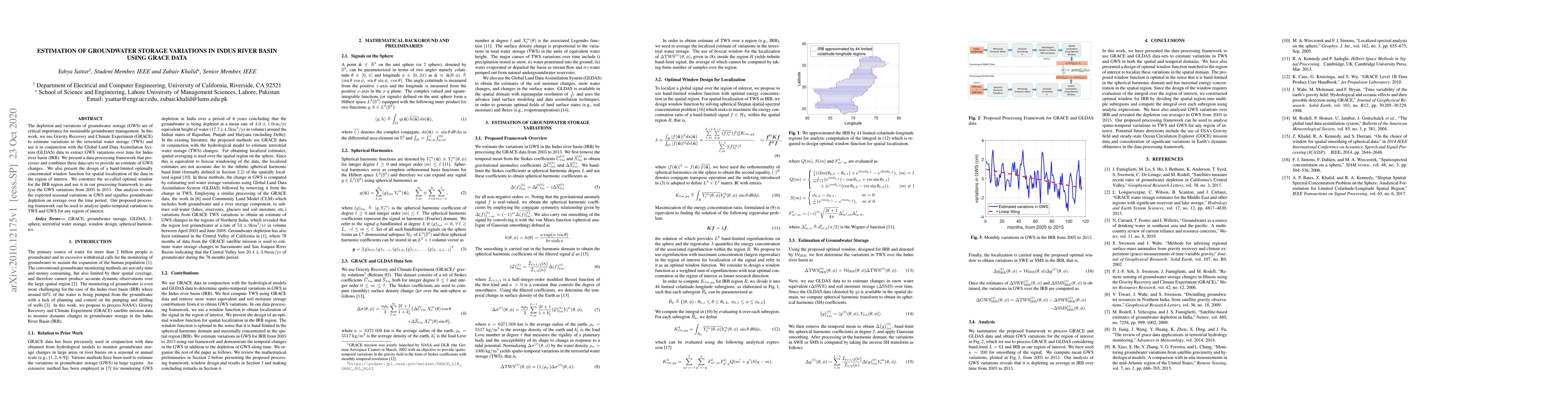 This study uses GRACE data and GLDAS to estimate groundwater storage variations in the Indus River Basin from 2005 to 2015, revealing seasonal fluctuations and overall groundwater depletion. The proposed framework can be applied to analyze terrestrial water storage variations in other regions.