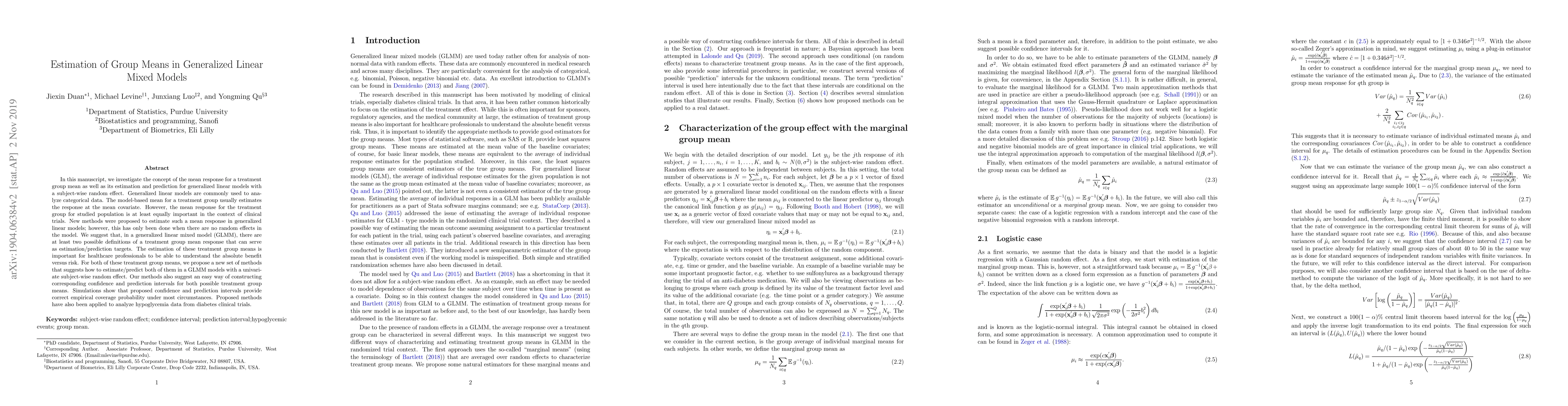 This paper proposes new methods for estimating treatment group mean responses in generalized linear mixed models (GLMM) with subject-wise random effects, addressing the gap in existing literature for such models. The proposed methods provide accurate estimation and prediction of treatment group means, along with corresponding confidence and prediction intervals, validated through simulations and applied to diabetes clinical trial data.
