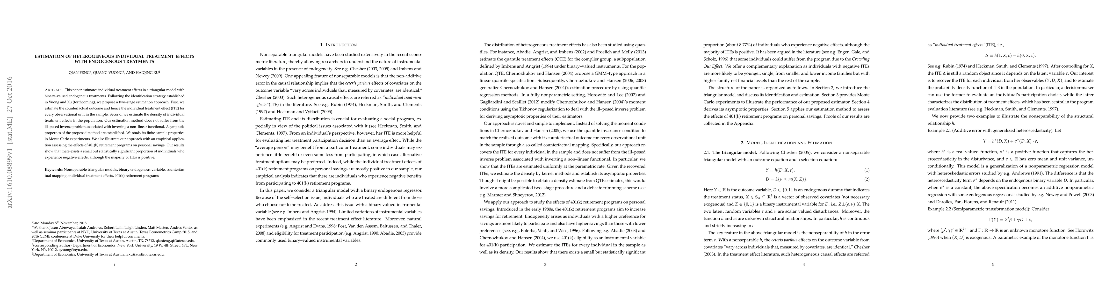 This paper proposes a two-stage estimation method to determine individual treatment effects in a triangular model with endogenous binary treatments, avoiding the inverse problem issue. The approach demonstrates positive majority effects but also identifies a small group with negative impacts, as shown in an empirical study on 401(k) retirement programs.