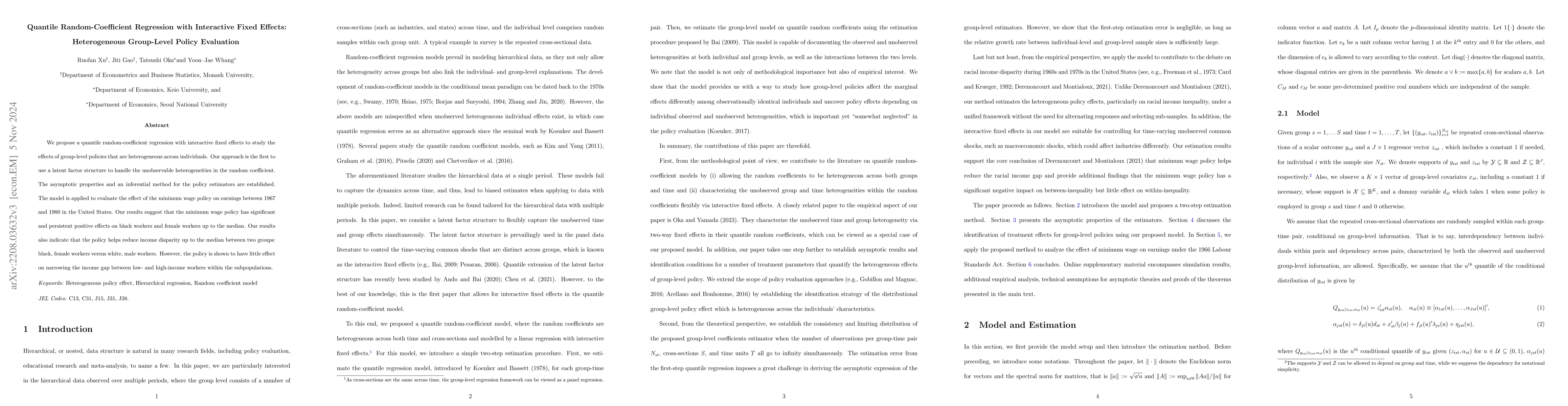 This paper proposes a method using quantile regression with interactive fixed effects to estimate heterogeneous treatment effects of group-level policies, focusing on distributional impacts, particularly on inequality. The study finds that the minimum wage policy significantly reduces between-inequality but has minimal effect on within-inequality in the U.S. between 1967 and 1980.