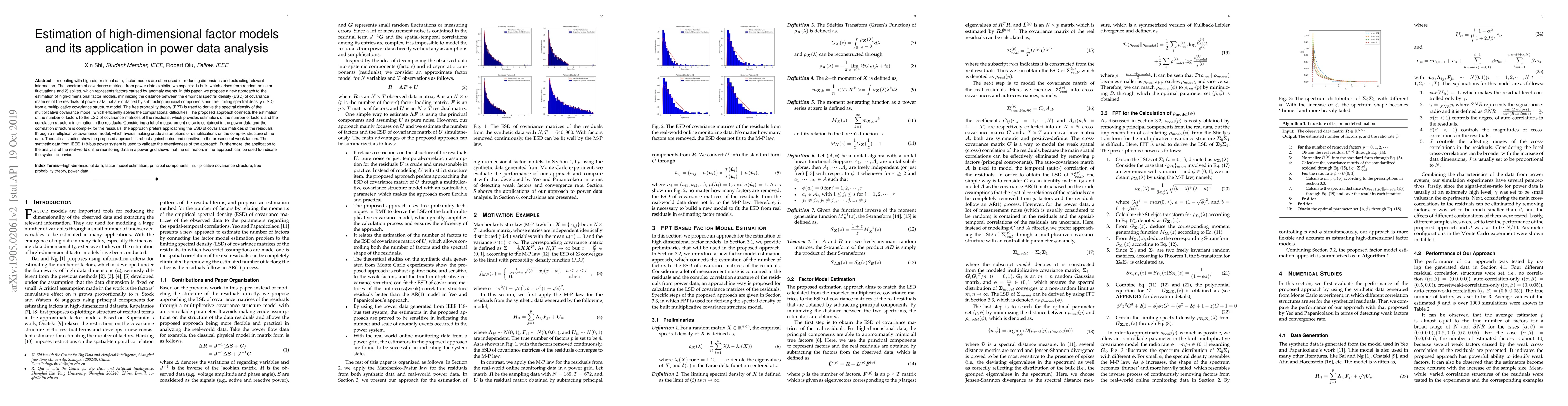In dealing with high-dimensional data, factor models are often used for reducing dimensions and extracting relevant information. The spectrum of covariance matrices from power data exhibits two aspects: 1) bulk, which arises from random noise or fluctuations and 2) spikes, which represents factors caused by anomaly events. In this paper, we propose a new approach to the estimation of high-dimensional factor models, minimizing the distance between the empirical spectral density (ESD) of covariance matrices of the residuals of power data that are obtained by subtracting principal components and the limiting spectral density (LSD) from a multiplicative covariance structure model. The free probability theory (FPT) is used to derive the spectral density of the multiplicative covariance model, which efficiently solves the computational difficulties. The proposed approach connects the estimation of the number of factors to the LSD of covariance matrices of the residuals, which provides estimators of the number of factors and the correlation structure information in the residuals. Considering a lot of measurement noise is contained in the power data and the correlation structure is complex for the residuals, the approach prefers approaching the ESD of covariance matrices of the residuals through a multiplicative covariance model, which avoids making crude assumptions or simplifications on the complex structure of the data. Theoretical studies show the proposed approach is robust against noise and sensitive to the presence of weak factors. The synthetic data from IEEE 118-bus power system is used to validate the effectiveness of the approach. Furthermore, the application to the analysis of the real-world online monitoring data in a power grid shows that the estimators in the approach can be used to indicate the system behavior.